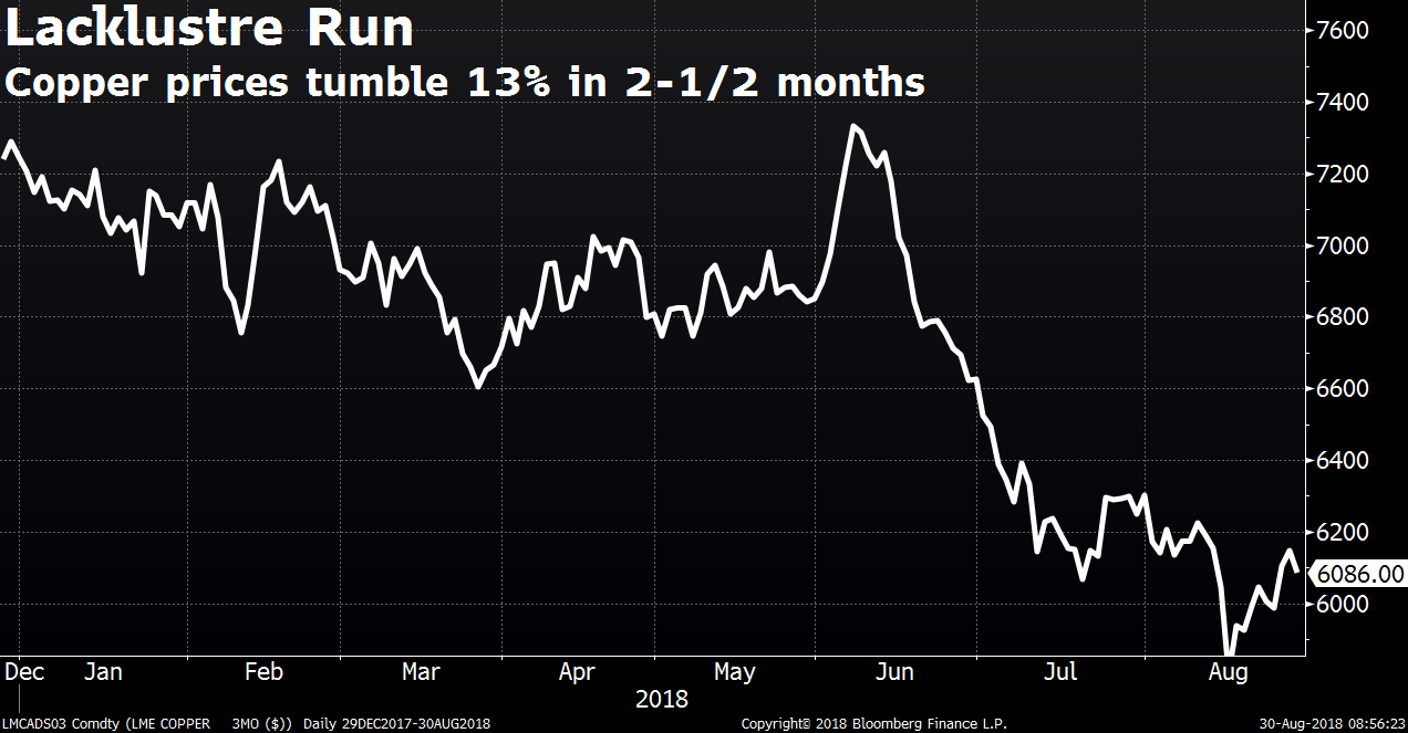 The reasons for the fall included concerns over the economic crisis in Turkey, the U.S.-China trade war and a slump in the Chilean peso. The south American nation is the world's largest miner of the metal.