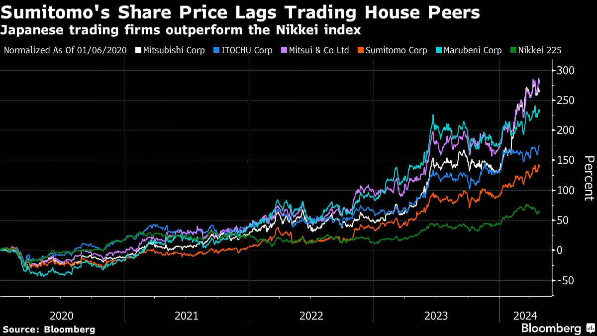 Sumitomo is Japan's fourth-largest trading firm with a market capitalization of ¥4.8 trillion, data compiled by Bloomberg show. It has a price-to-book ratio of 1.1 and a forward 12-month price-to-earnings ratio of 9.5, both the lowest among its peers. Sumitomo's fiscal 2023 earnings are due Thursday, when the company is also scheduled to reveal its medium-term business plan.