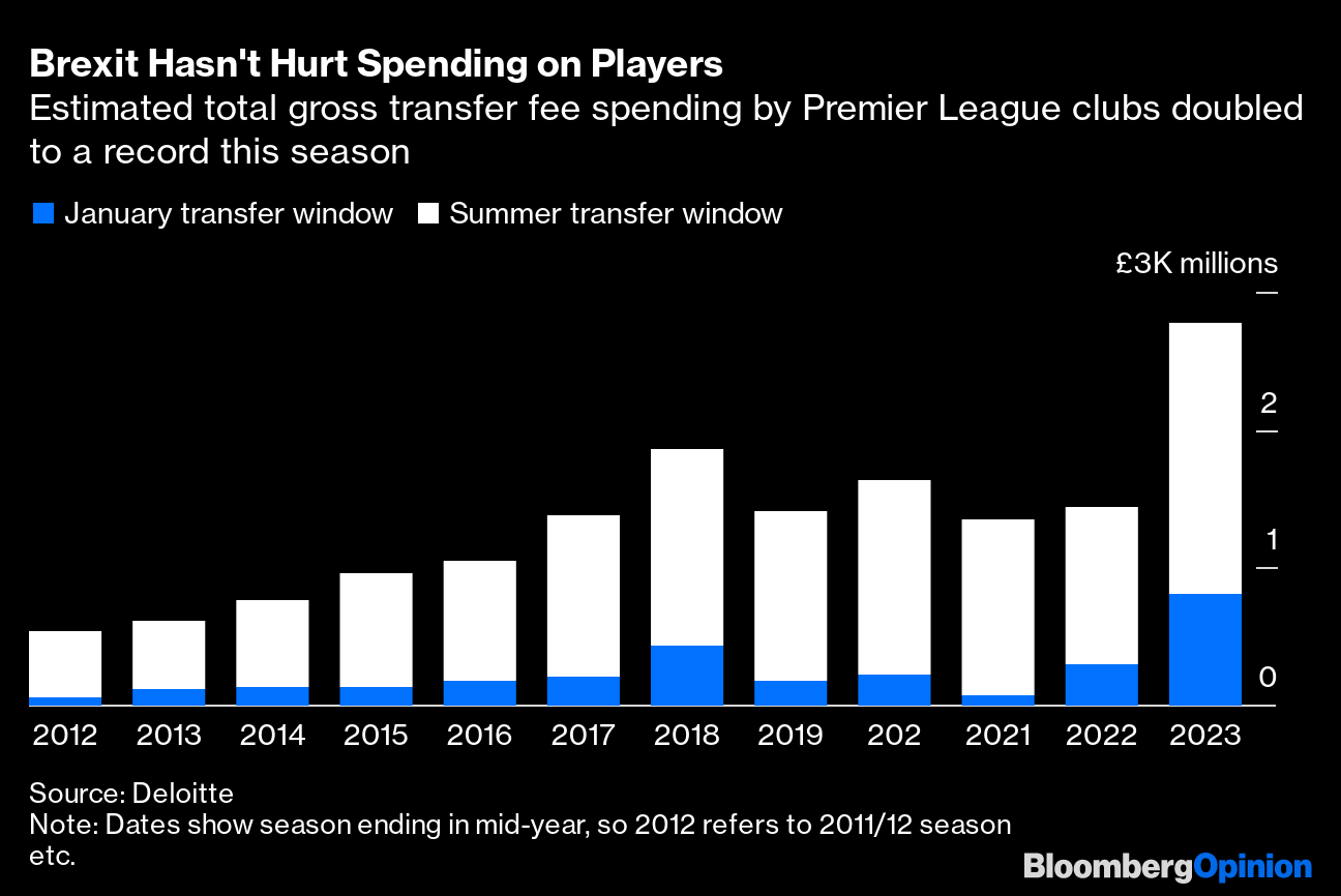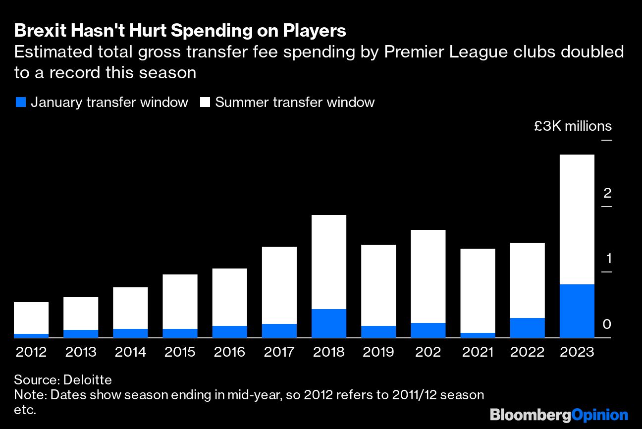 The impact isn't confined to England; it is fanning out through Europe too. Spending on transfers by Premier League clubs doubled to a record £2.8 billion this season. In the January transfer window, Chelsea's gross expenditure was more than the combined total of all clubs in Germany's Bundesliga, Spain's La Liga, Italy's Serie A and France's Ligue 1. The Premier League's outlays prompted La Liga President Javier Tebas to call the UK a “doped market” that could jeopardize the sustainability of European football.