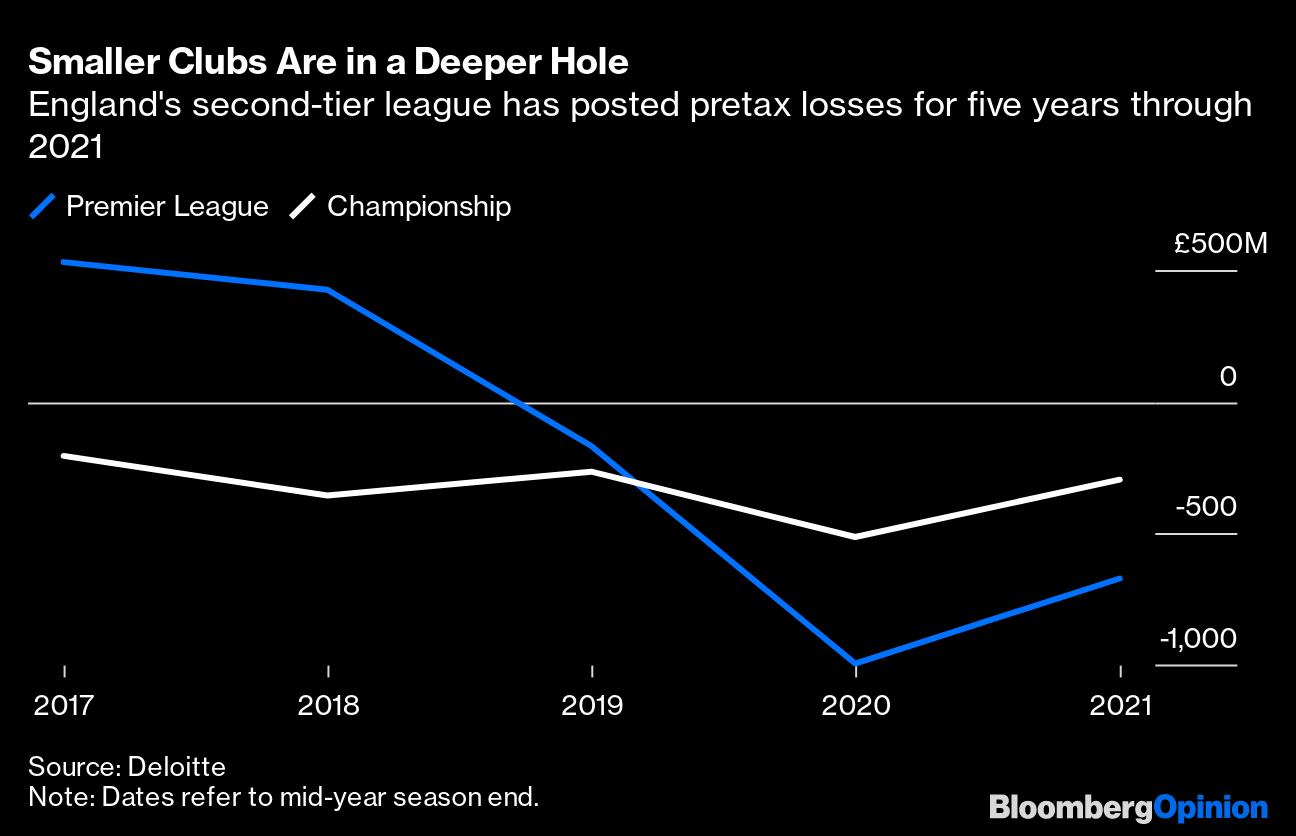 The most vivid illustration of this peril can be seen in wage-revenue ratios. Analysis by UEFA, European football's governing body, indicates that total wages as a proportion of revenue shouldn't go above 70% if a club is to have a chance of breaking even. In the Premier League, the ratio was 71% in the 2020-21 season, down from 73% a year earlier, according to figures from Deloitte. For the Championship, England's second-tier league, the ratio rose to 125% from 120%. That's clearly unsustainable. Championship clubs have posted pretax losses for the past five years. “There now can be no doubt that significant change is required to drive long-term sustainability, without the need for continual owner funding at this level,” Deloitte said in its last annual review of football finance.