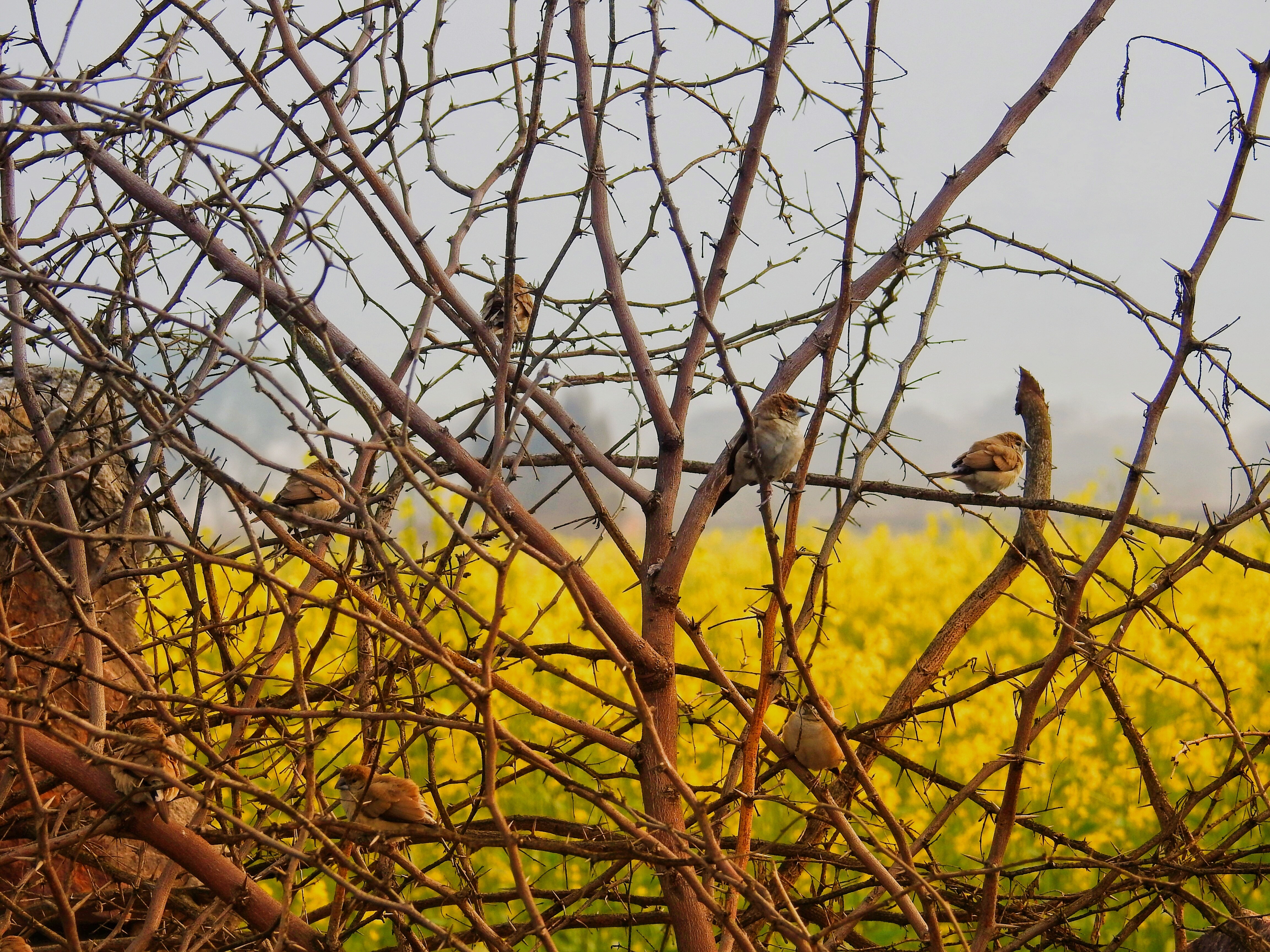 Silverbill munias in a mustard field in January. (Photographer: Neha Sinha)