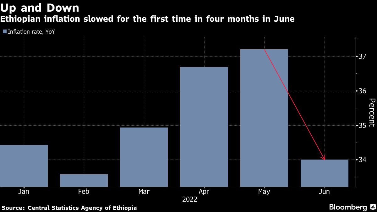 The annual inflation rate in the Horn of Africa country dropped to 34% from 37.2% in May, according to data from the Central Statistics Agency of Ethiopia. Food-price growth slowed to 38.1% from 43.9%, while non-food inflation was little-changed at 28.4%.