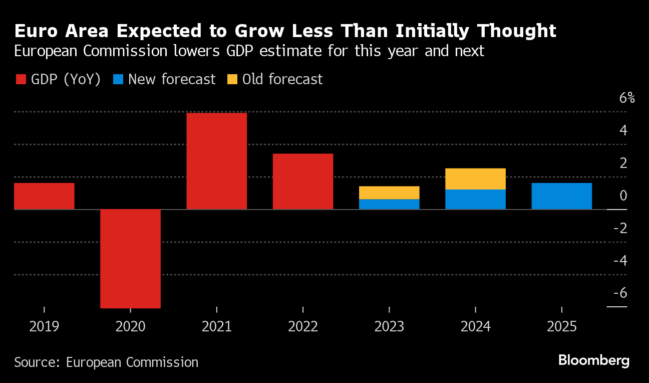 For the full year, the EU's executive arm now sees 0.6% growth, down from a September forecast of 0.8%. That's seen picking up to 1.2% in 2024 and 1.6% in 2025 — a slightly more optimistic view than that of the European Central Bank.