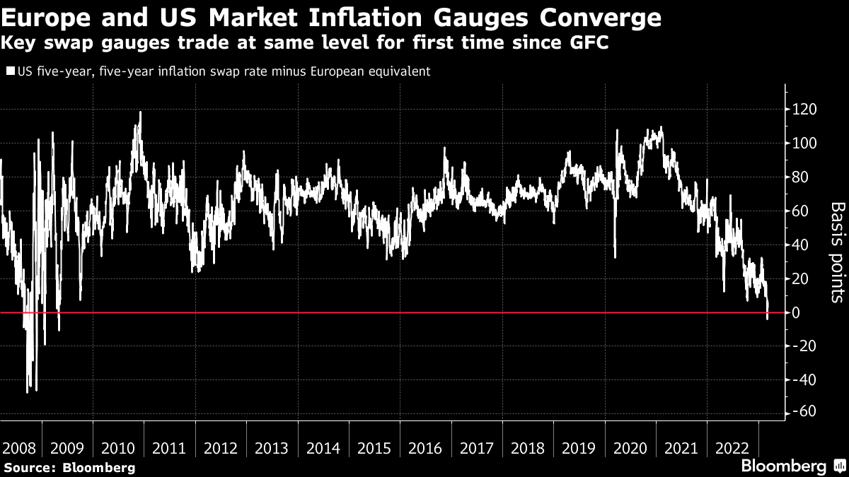 Long-term measures of European price pressures lagged US equivalents for years since the global financial crisis before consumer prices last year surged to a record. Concerns around energy security and wage pressures are contributing to speculation of an inflationary regime shift.