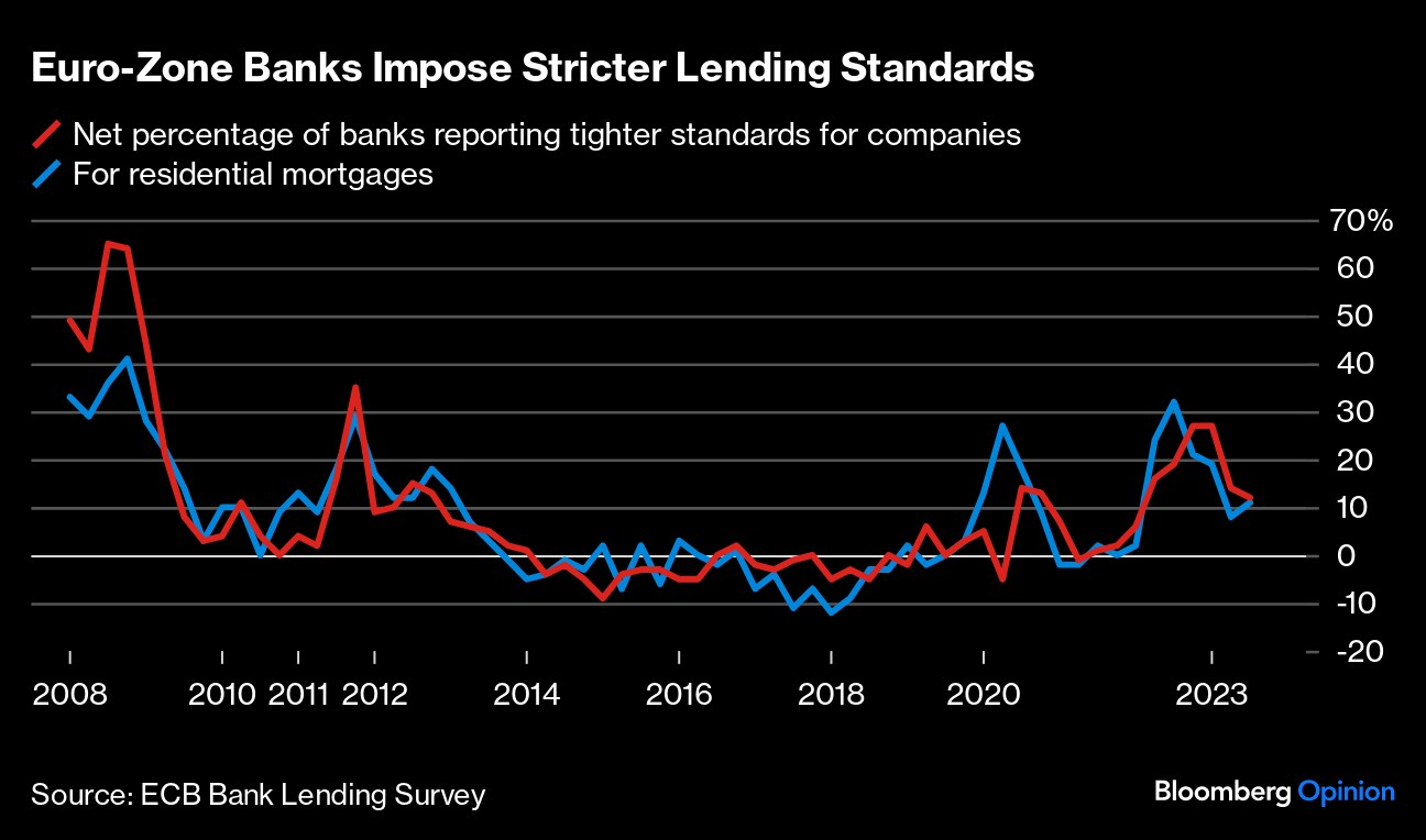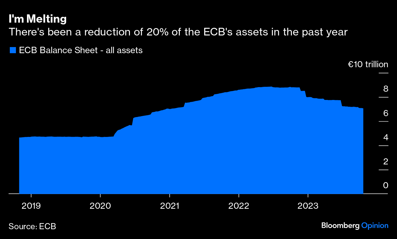 That's a clear and present danger. Following eight years of a negative rate regime, a sudden 450 basis points of tightening in little over a year is delivering a shock to the euro region. Furthermore, the monetary pinch isn't just about higher official rates. The ECB's balance sheet has shrunk by 20%, or nearly €7 trillion ($7.4 trillion), in less than a year. It's also withdrawn super-generous commercial bank loans, and has stopped paying interest on reserves that banks have to keep with it.