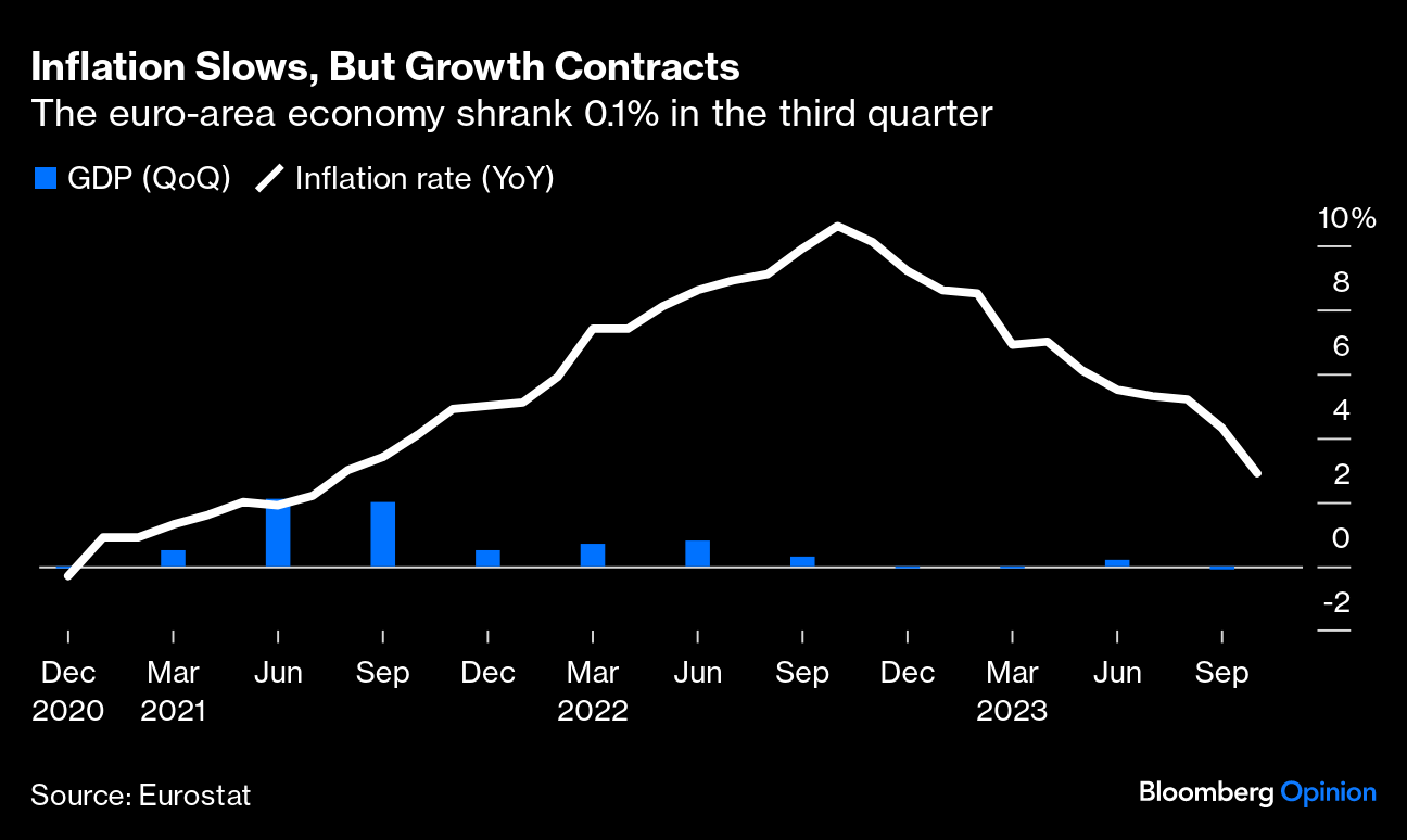 (Bloomberg Opinion) -- Recession looms for the euro area, with the latest batch of data showing momentum has evaporated. The economy contracted by 0.1% in the third quarter, most of the bloc's economies are flatlining, and Germany, its biggest engine of growth, is shrinking. Even supposedly good news, such as slowing inflation, just illustrates how quickly the outlook is deteriorating. It's time to improve coordination between fiscal and monetary policies, which worked wonders during the pandemic but risks being rendered pointless.
