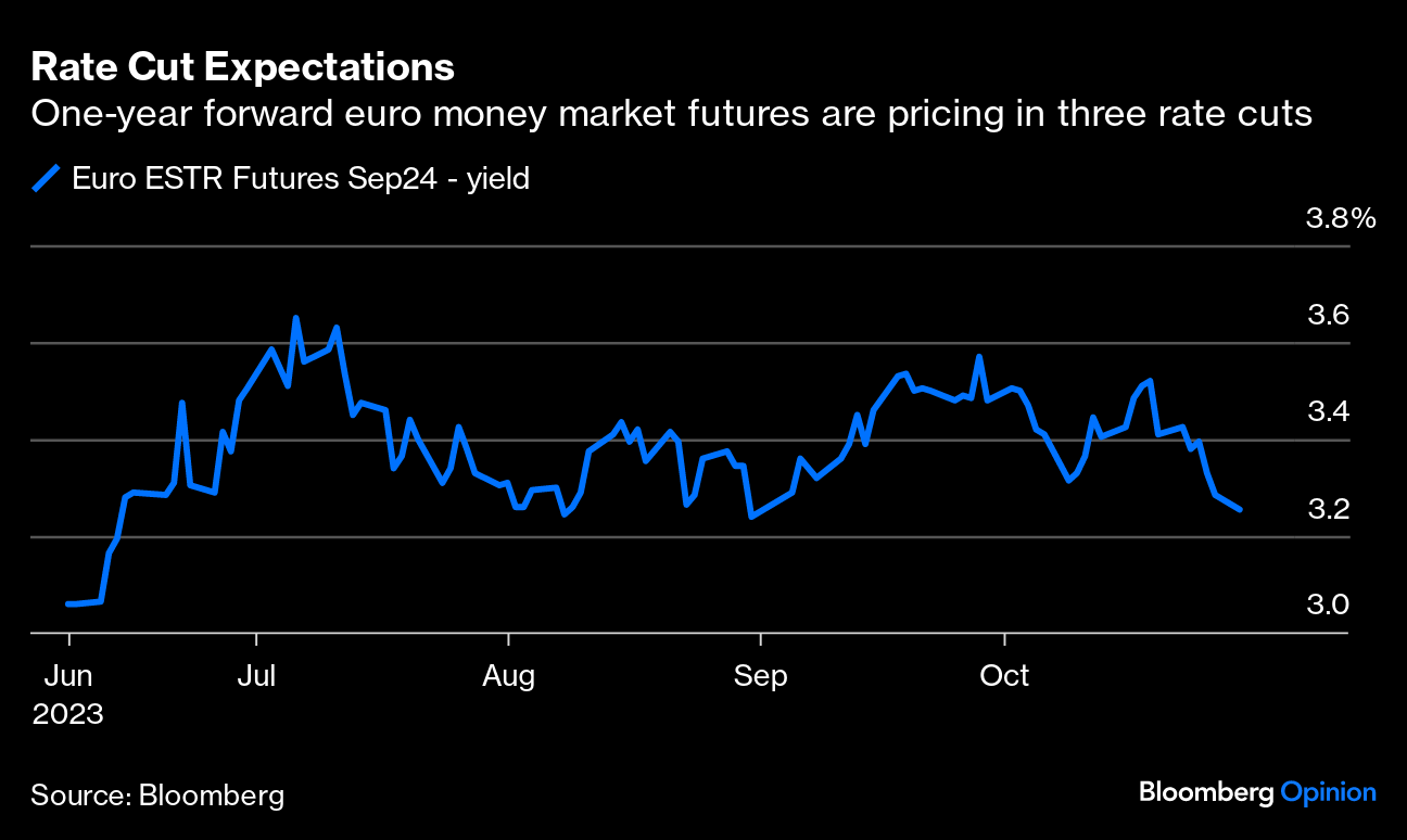 The Governing Council is adamant that it's not ready to contemplate lowering borrowing costs, with core inflation still running at more than double the ECB's 2% target. However, money-market futures have already fully priced in the first rate cut from April next year, with two additional quarter-point reductions anticipated by this time next year — a doubling of what was expected just two weeks ago. Expectations are changing fast and may well start to price in deeper cuts if the economy continues to worsen.