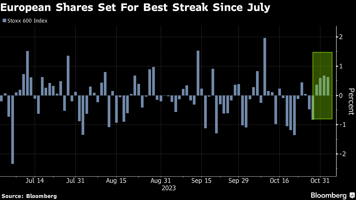 European shares are having a good week, following a rout in October that brought the gauge close to erasing the year's gains. Investors remain focused on monetary policy, while parsing the latest company results and tracking developments in the Israel-Hamas war.