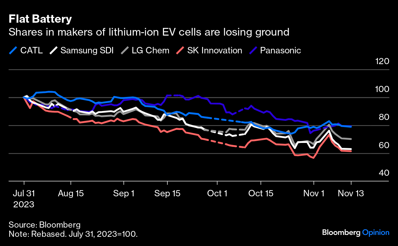 Those fears have spread from the top to the bottom of the electric vehicle supply chain. Have a look at the five big manufacturers of EV batteries (excluding BYD Co., which makes cars as well) and you see a remarkably similar pattern. Shares are all down by roughly a third from the end of July: