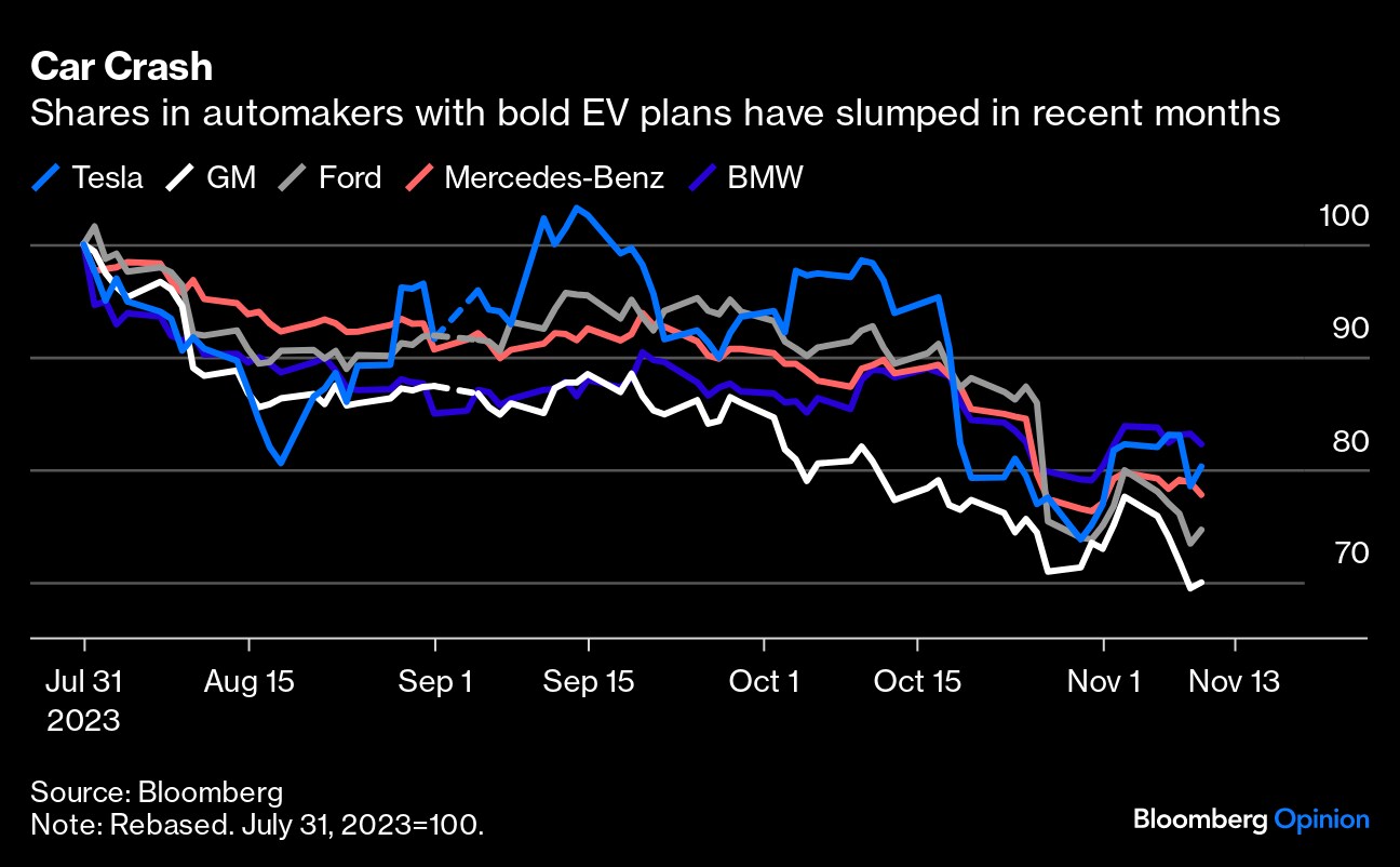 The carmakers who've promised multi-billion-dollar plans to pivot to battery vehicles are being savaged by equity investors, with shares in General Motors Co. down 30% since the start of August and even perennial market darling Tesla Inc. falling 16%. An automotive chief executive officer can't stand on a stage these days without downgrading some aspect of their EV rollout plans. While sales are still growing at double-digit rates, expectations of a rapid switch away from conventional drivetrains have taken a hit.