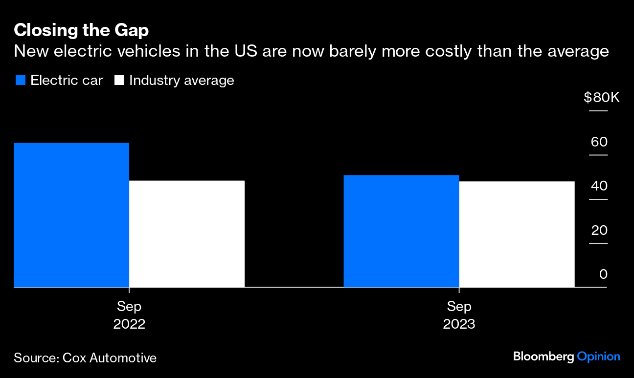 That's now well within view. In China, EVs have already reached price parity with conventional vehicles. In the US, the average battery car sold in September retailed for $50,683, barely above the $47,899 for the industry as a whole, according to Cox Automotive — a 5.8% premium, compared to 35% 12 months earlier. Prices for cells in China are running well below the levels needed to build battery packs for less than $100 a kilowatt hour, based on data from consultants Intercalation. That's long been considered a holy grail for the industry, a level at which EVs would become comprehensively cheaper than the competition.