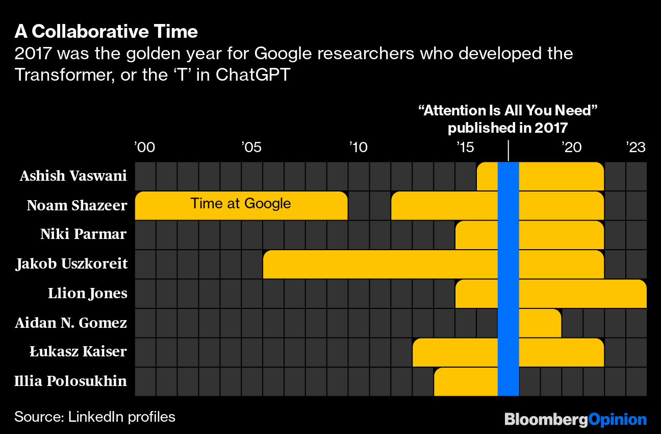 In 2017, researchers at Alphabet Inc.'s Mountain View, California, headquarters were talking over their midday meal about how to make computers generate text more efficiently. Over the next five months they ran experiments and, not realizing the magnitude of what they'd discovered, wrote their findings up in a research paper called “Attention is All You Need.” The result was a leap forward in AI.