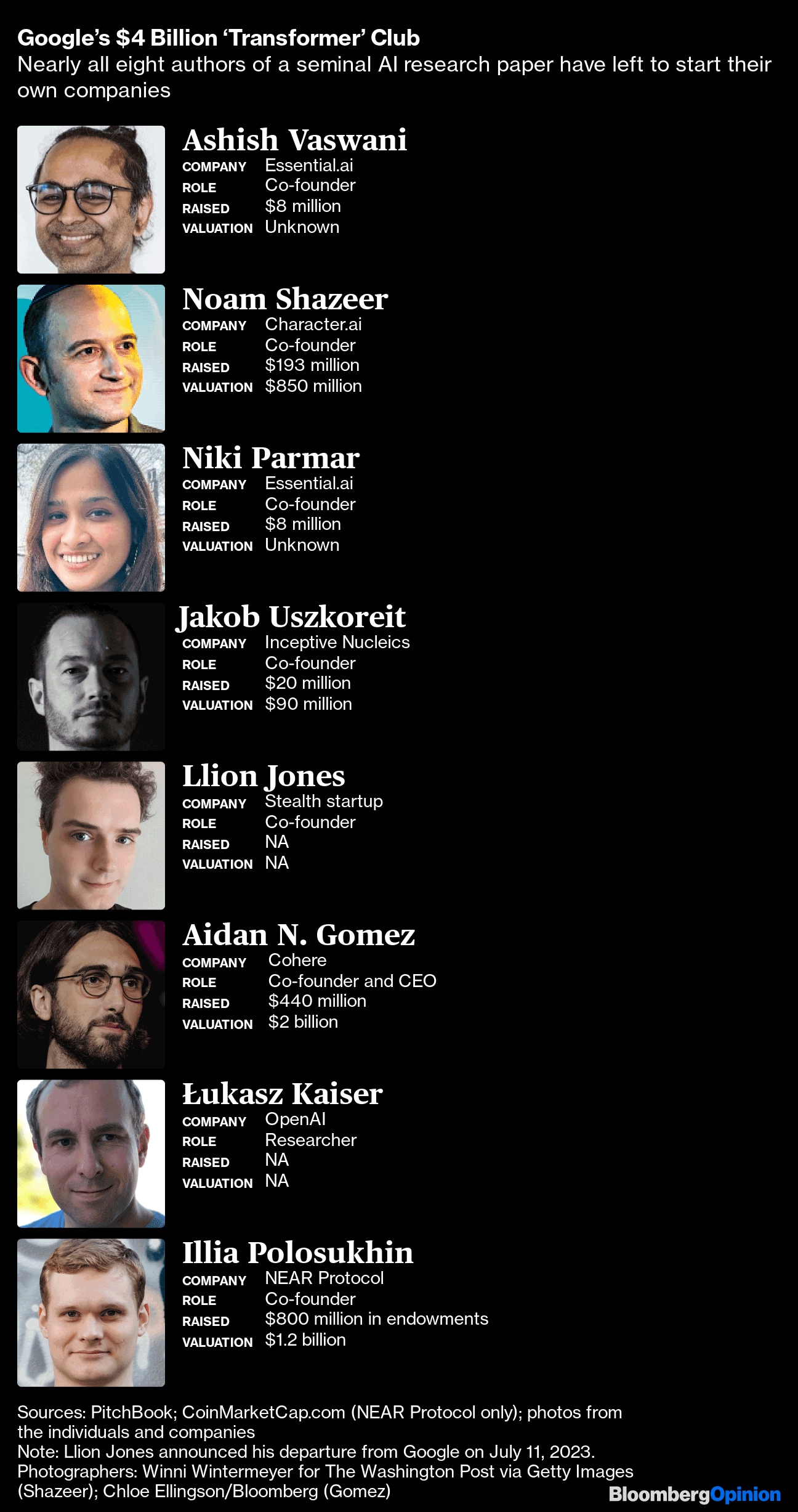 The researchers who co-authored the 2017 paper didn't see a long-term future at Google either. In fact, all of them have since left the company. They've gone on to launch startups including Cohere, which makes enterprise software, and Character.ai, founded by Noam Shazeer, the longest-serving Googler in the group who was seen as an AI legend at the company. Combined, their businesses are now worth about $4.1 billion, based on a tally of valuations from research firm Pitchbook and price-tracking site CoinMarketCap. They are AI royalty in Silicon Valley.