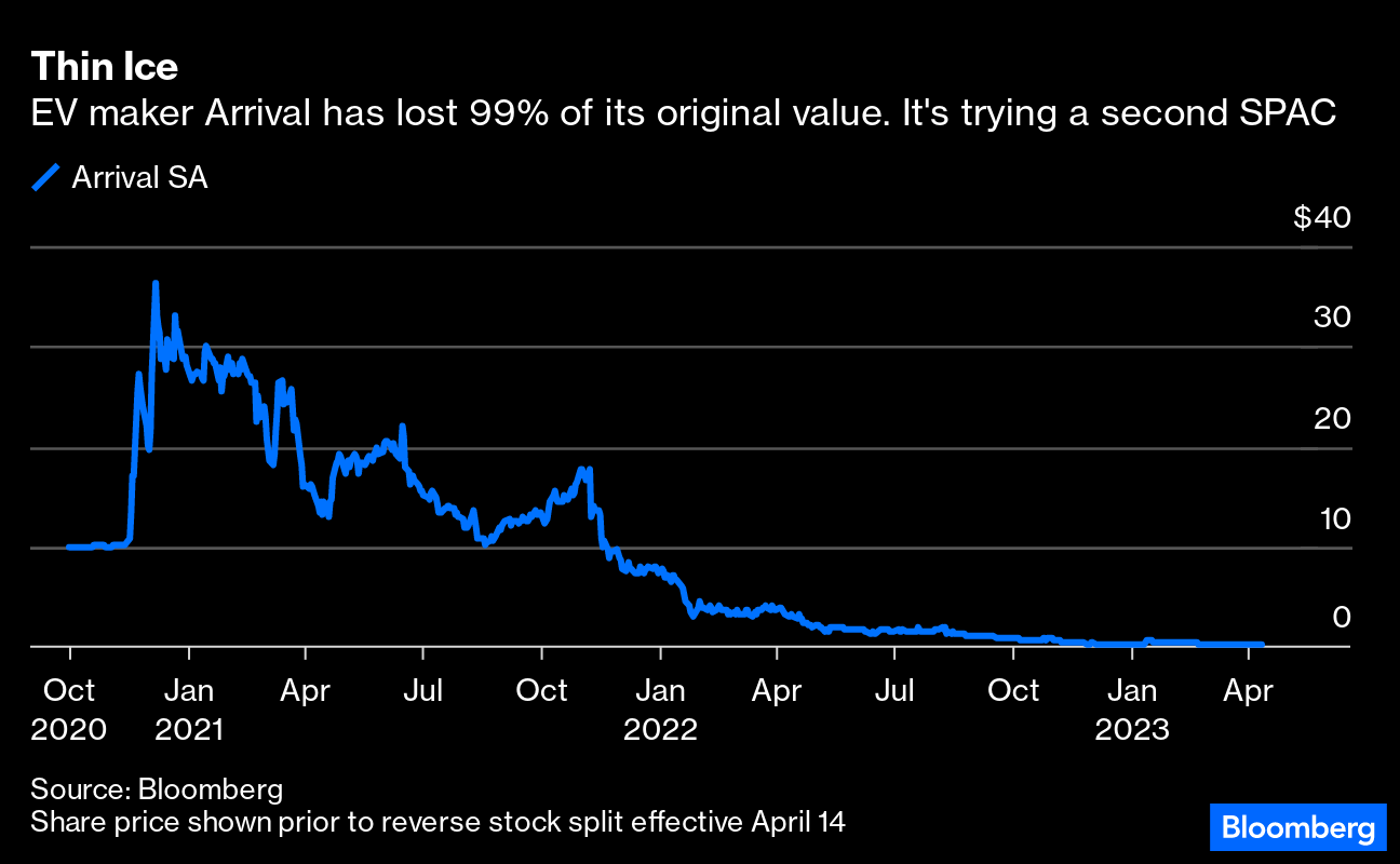 Hence the pickle that businesses like Arrival SA find themselves in. Its shares have collapsed by 99% since a SPAC listing in 2021 valued the UK electric-van manufacturer at $13.5 billion. Last week, Arrival said it would seek to replenish its coffers by merging with yet another SPAC in a deal could that see current Arrival shareholders left with just 13% of the combined company. In February, Arrival also secured a deeply discounted equity injection and debt for equity swap from Antara Capital Master Fund LP, requiring the issuance of several hundred million new shares. A proposed 1-for-50 reverse stock split hasn't fooled investors about the massive dilution they're facing.