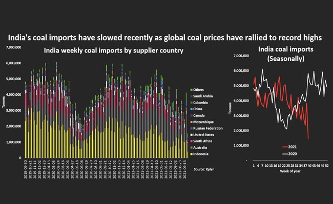 India's average weekly coal imports during August through late September - when global coal prices rallied over 40 per cent to all-time highs - dropped by more than 30% from the average for the first seven months of the year to just under 3 million tonnes, according to data compiled by Kplr.