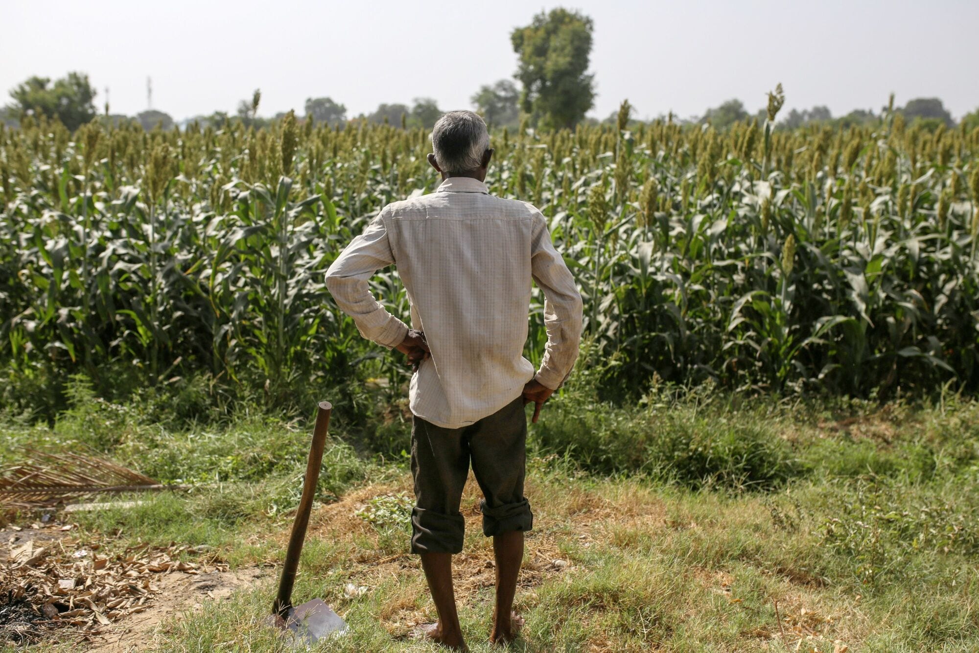 A worker stands by the sorghum field at Narayan Dairy Farm in Anand district, Gujarat, India, on Thursday, June 2, 2022. Heat and drought are inflicting perilous strain on dairy cows across the globe, drying up their milk production and threatening the long-term global supply of everything from butter to baby formula. Photographer: Dhiraj Singh/Bloomberg