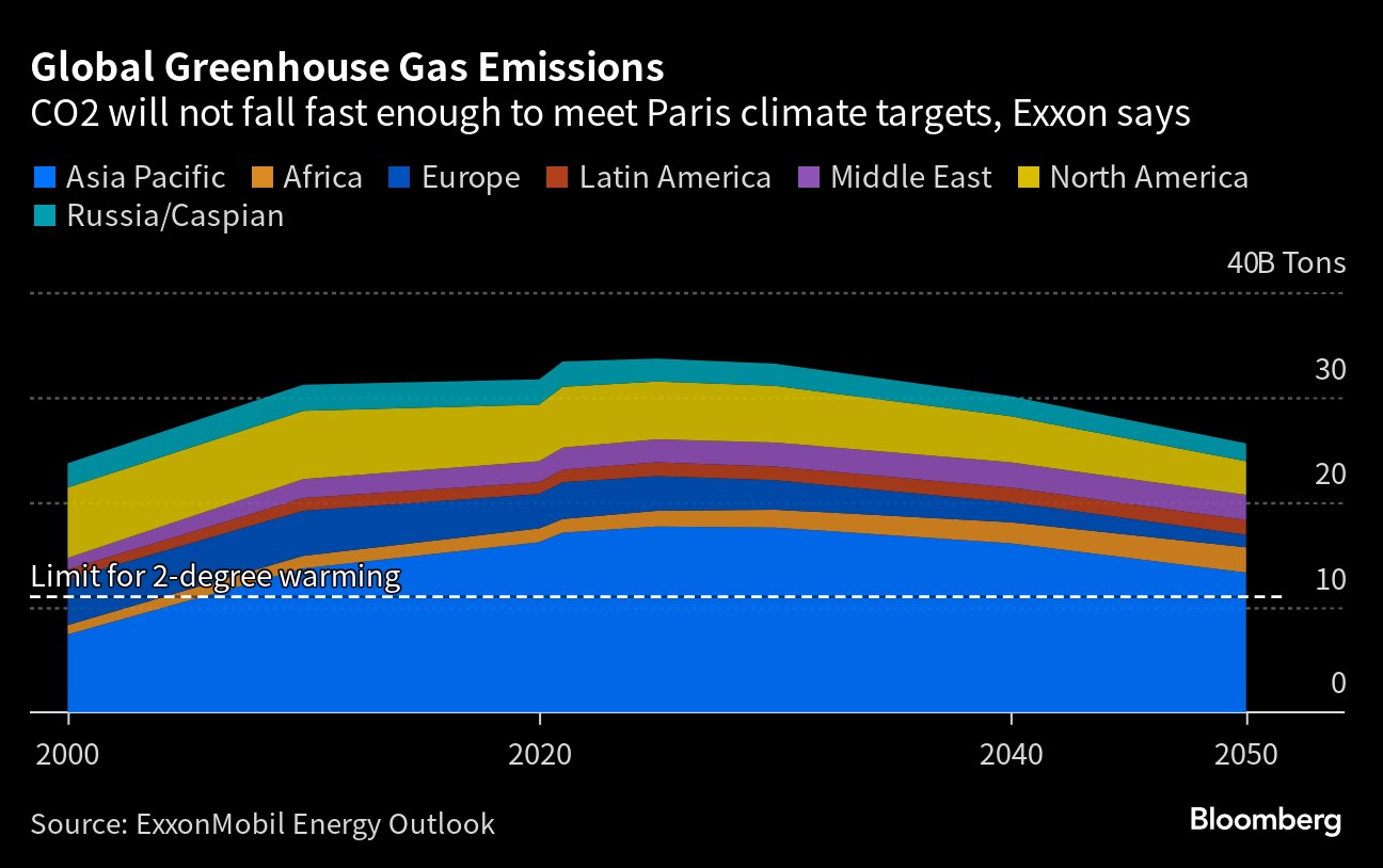 (Bloomberg) -- Exxon Mobil Corp. sees the world failing to reduce emissions fast enough to limit global warming to 2C (3.6F) above pre-industrial norms by 2050 due to soaring economic growth, particularly in developing countries.