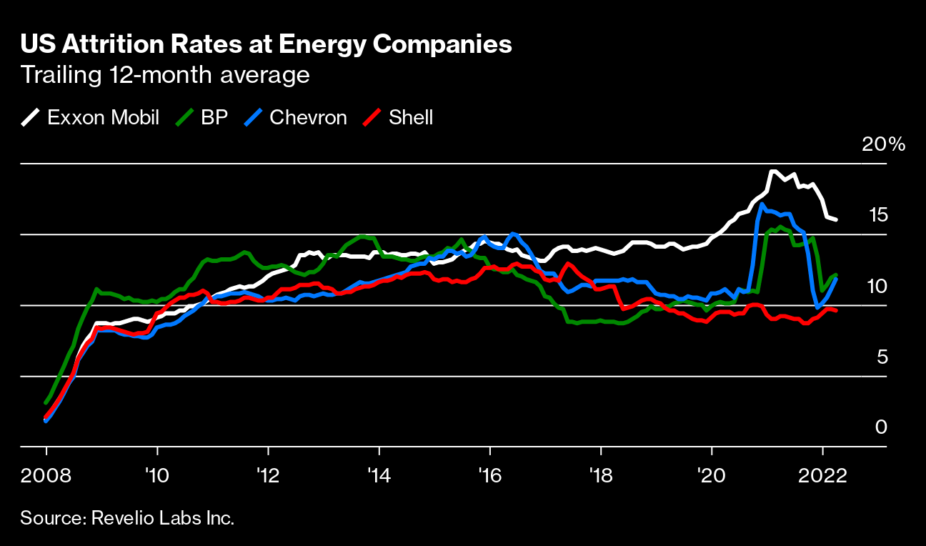 By the end of 2021, Exxon's attrition rate in the US was 18%, about the same as the nationwide average but almost double the average of its peers including BP, Chevron, and Shell, according to Revelio Labs, a workforce intelligence company that tracks data from public employment records. Exxon disagrees with the analysis and says its attrition is in line with peers'.