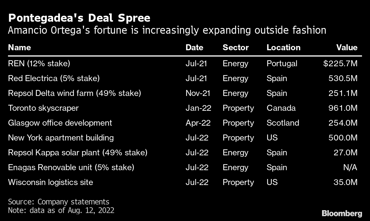 Fueled by proceeds from his fashion empire, the billionaire's family office, Pontegadea, has gone on a deals spree that shows no sign of abating. In the past year, it accumulated stakes in energy ventures worth more than $1 billion and spent almost $2 billion on real estate globally.
