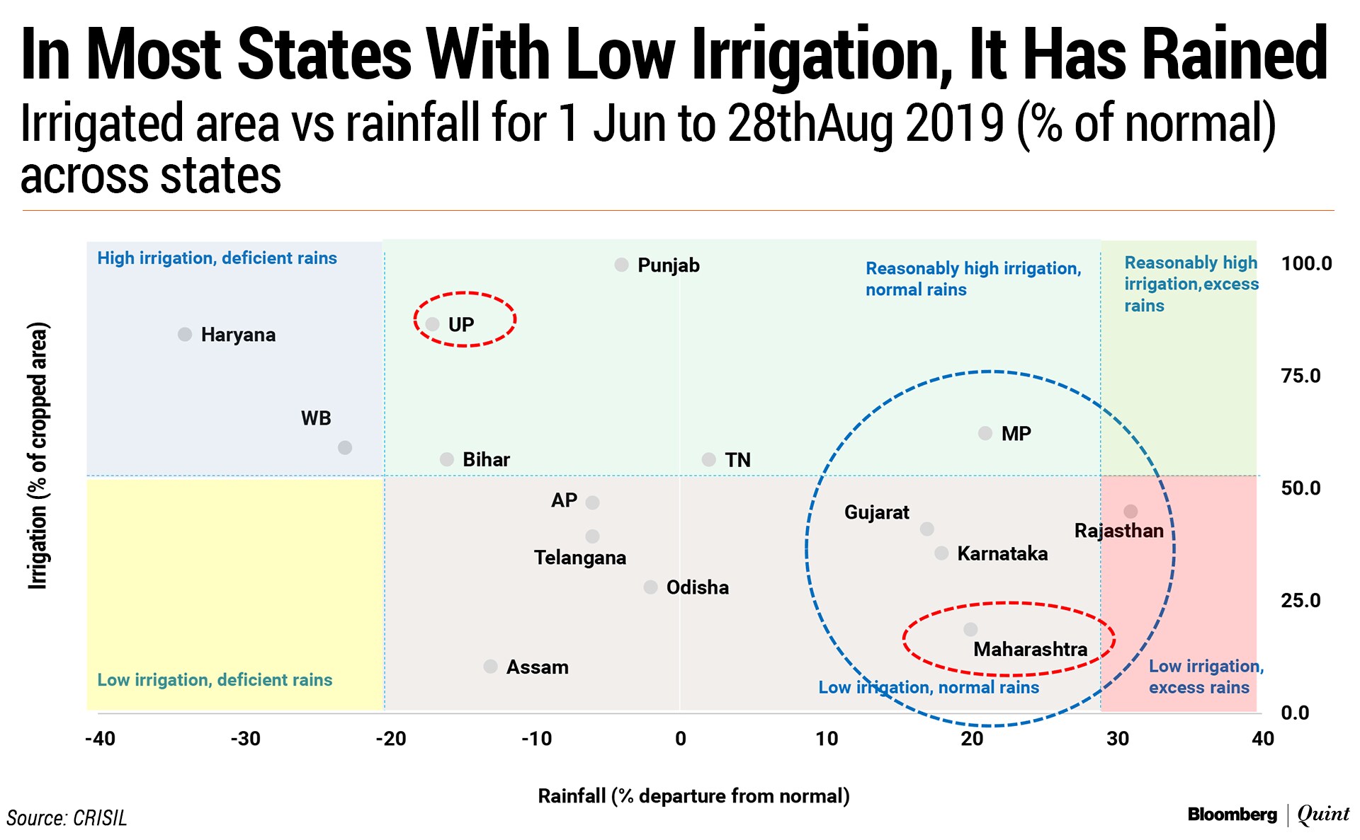 The southwest monsoon went from 36 percent deficiency in the beginning of the season to a surplus of 2 percent of the long-period average as on Aug. 23, according to India Meteorological Department. Area covered under kharif crop saw a modest decrease in 2019 of about 2.6 percent over a year ago.