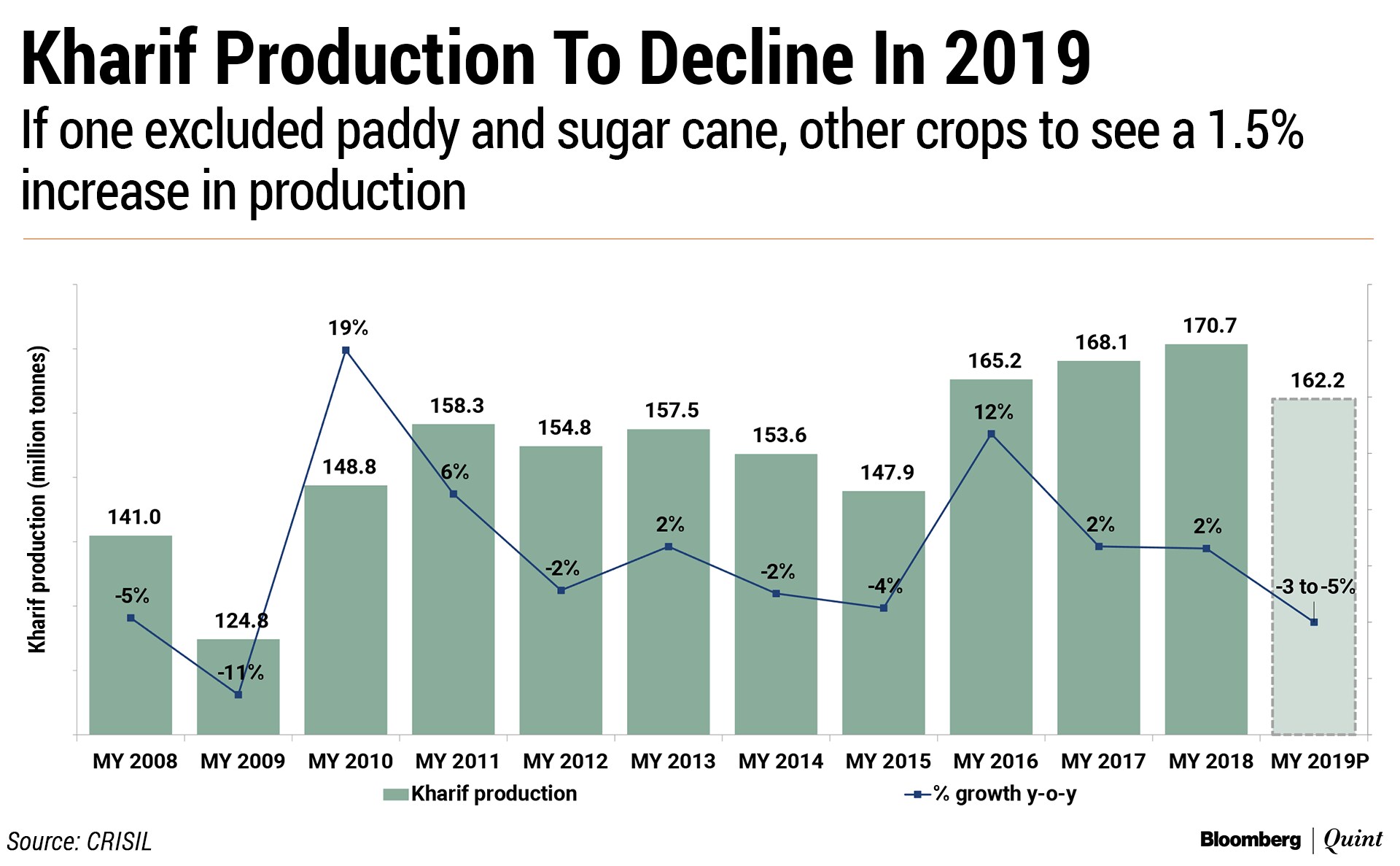 Rainfall patterns have affected kharif crops, particularly paddy, which is likely to take a hit on account of lower acreage and crop damage. Kharif production is estimated to fall 3 to 5 percent, according to Crisil's estimates, after three years of record output.