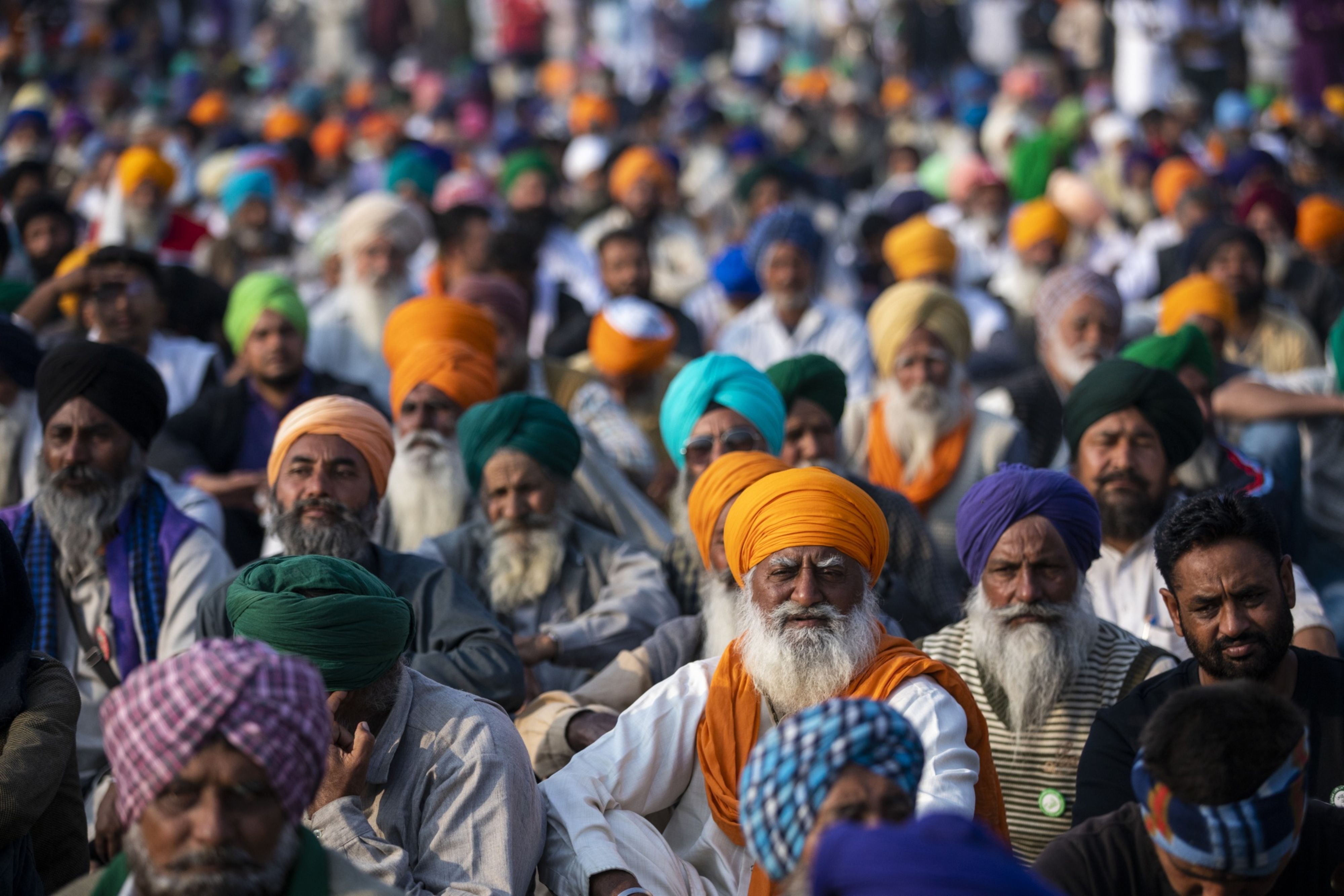 Farmers gather for a meeting at a protest site, in Singhu, Delhi, on Dec. 3, 2020. (Photographer: Prashanth Vishwanathan/Bloomberg)