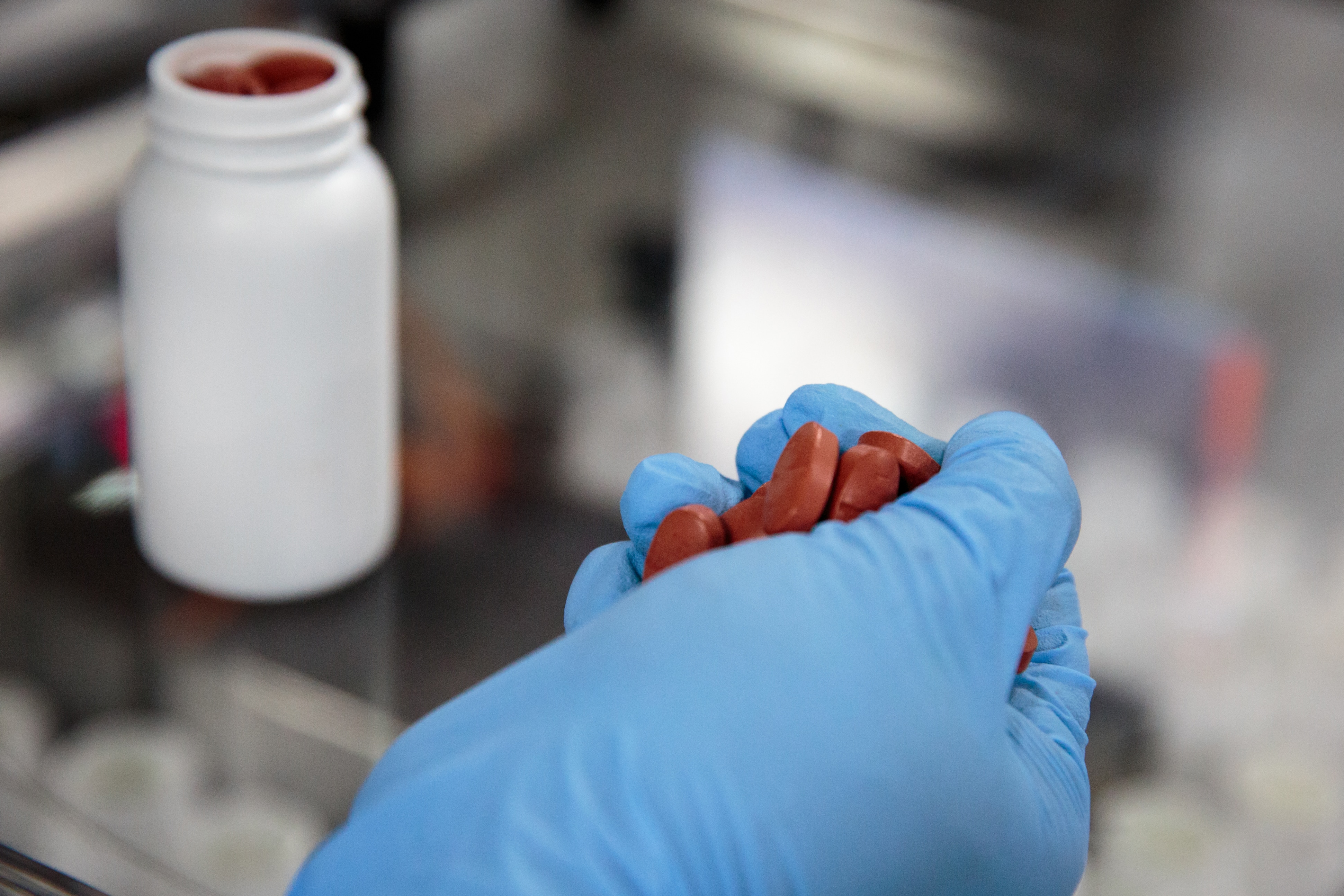 An employee holds pills at a pharmaceutical lab. (Photographer: Sara Hylton/Bloomberg)