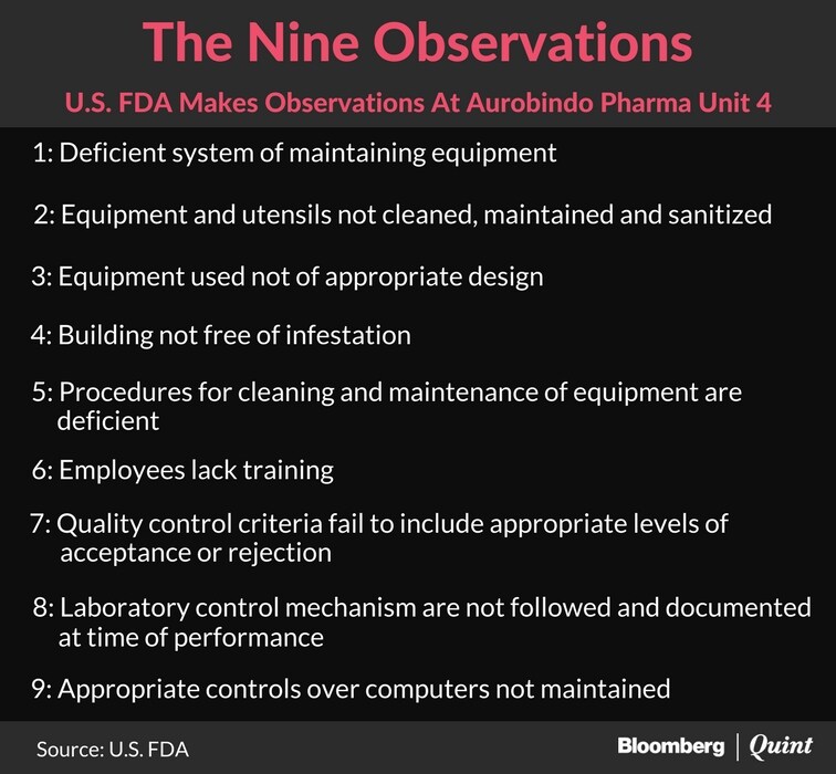 The observations for Unit 4 in Hyderabad relate to equipment and cleanliness, employees training, quality control and computer controls, according to the U.S. Food and Drug Administration's Form 483 reviewed by BloombergQuint. Aurobindo Pharma will now have to respond with corrective measures to get the plant cleared.