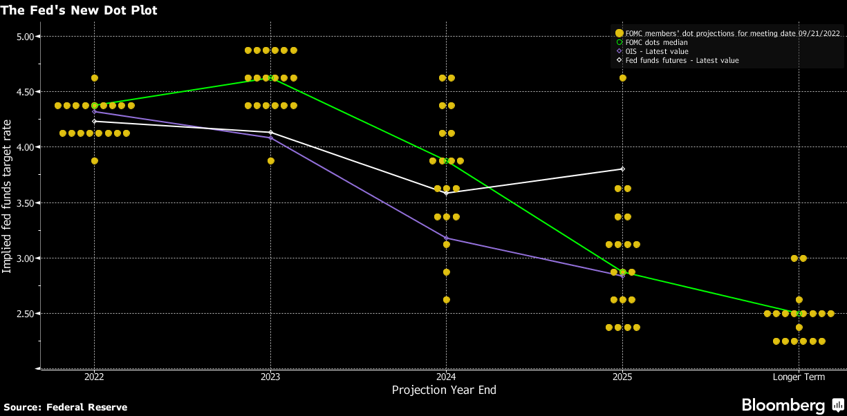 Officials forecast that rates would reach 4.4% by the end of this year and 4.6% in 2023, a more hawkish shift in their so-called dot plot than expected. That implies a fourth-straight 75 basis-point hike could be on the table for the next gathering in November, about a week before the US midterm elections.