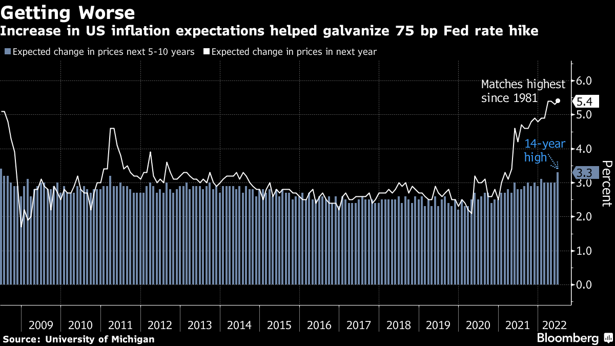 The preliminary June readings were “quite eye-catching, and we noticed that,” Powell said. “One of the factors in our deciding to move ahead with 75 basis points today was what we saw in inflation expectations,” in addition to the hotter-than-expected rise in the consumer price index for May released on Friday.
