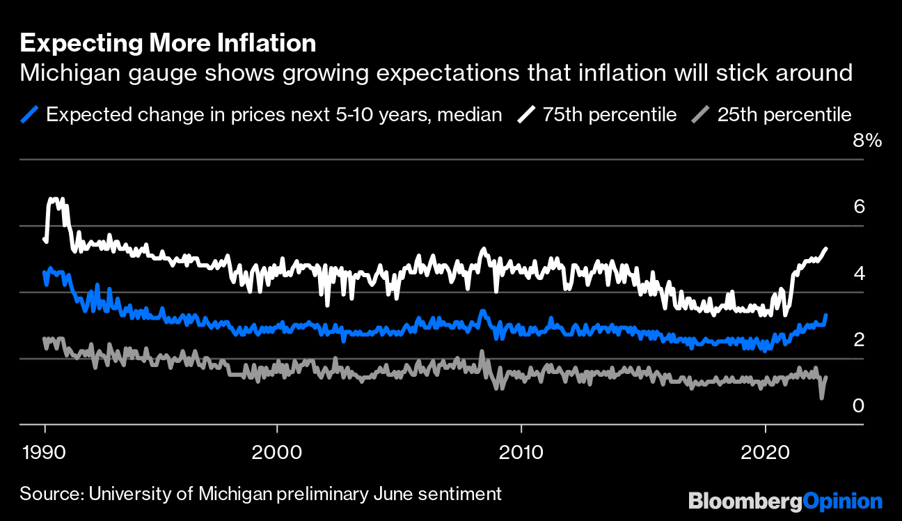 Once consumers believe inflation is getting away from policy makers, they may demand raises, which companies will deliver by raising the cost of manufactured goods even more — the dreaded wage-price spiral. As Powell put it Wednesday, the Fed is “absolutely determined” to keep inflation expectations anchored, and he said the increase in those expectations to the highest since 2008 — as measured by the University of Michigan's survey of consumers — played a significant role in the central bank's decision to raise interest rates by 75 basis points for the first time since 1994.