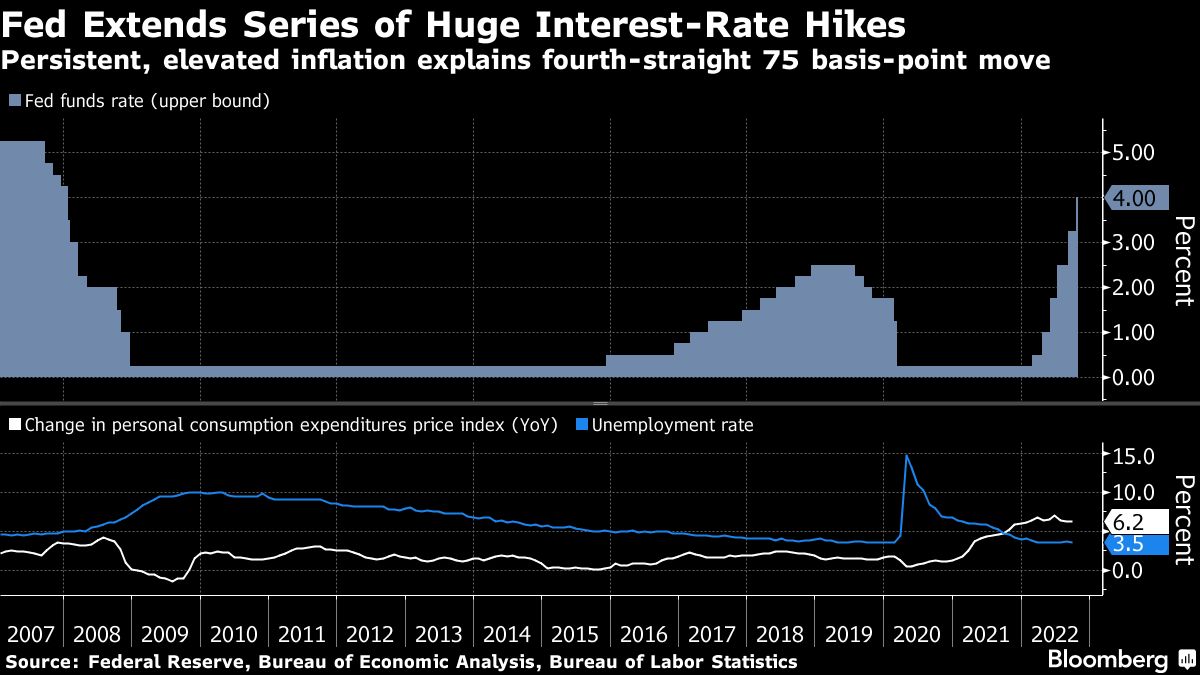 US central bankers this week raised rates by 75 basis points for the fourth straight time, lifting their benchmark to a target range of 3.75% to 4%. Chair Jerome Powell told reporters that officials could soon move to smaller interest-rate increases while ultimately taking borrowing costs to a higher level than the 4.6% previously expected.