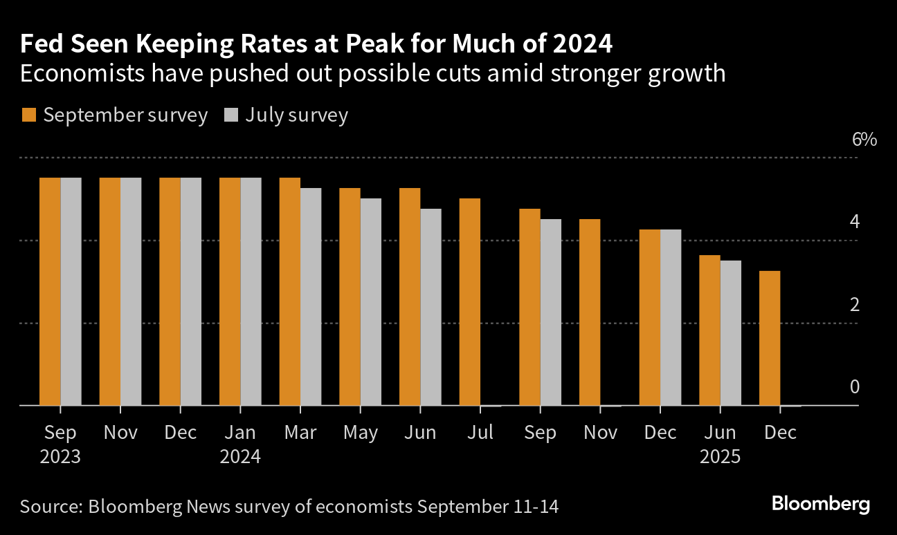 The Federal Open Market Committee will keep rates steady in the 5.25% to 5.5% range at its Sept. 19-20 meeting, the survey showed, and remain there until a first cut next May – two months later than the economists' view in July.