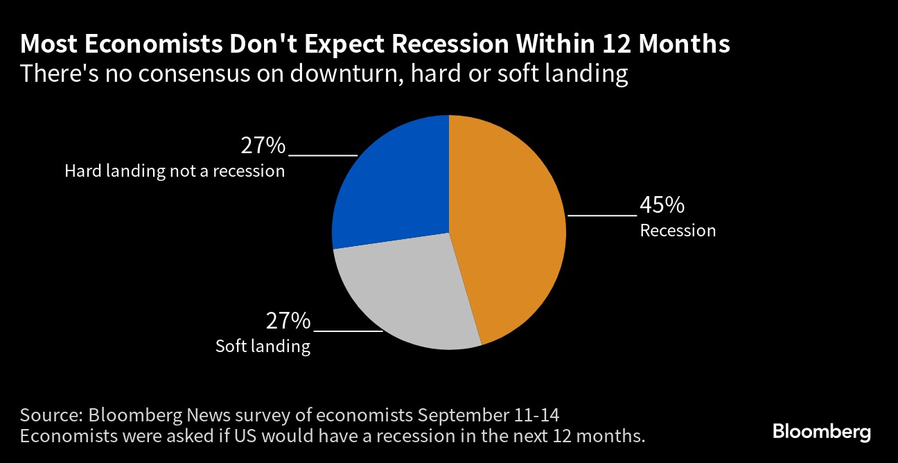 The economists have become gradually more optimistic about the outlook for the US economy, with 45% forecasting a recession in the next 12 months, compared with 58% in July and 67% in April. Fed officials have shared in the soft-landing optimism, with the Fed staff switching from a recession forecast earlier in the year to a continued expansion.