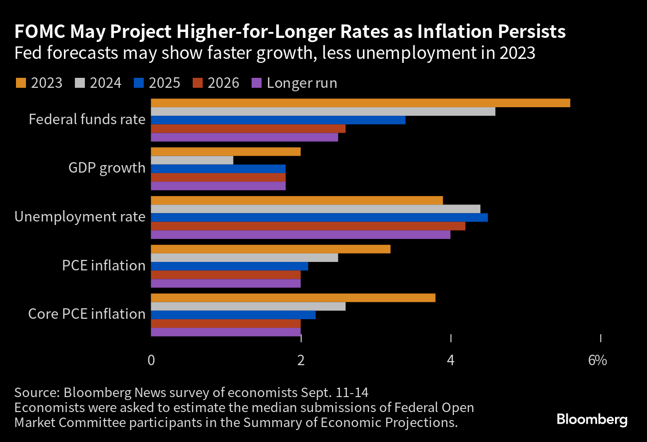 “Bloomberg Economics expects the FOMC to hold rates at 5.5% at the Sept. 19-20 meeting, something that Fed officials – even the most hawkish ones – telegraphed well ahead of time. More consequential will be what clues the FOMC offers on the future rate path. Positive economic surprises during the inter-meeting period will likely lead officials to sharply revise up their GDP growth forecasts, while marking down core inflation.”