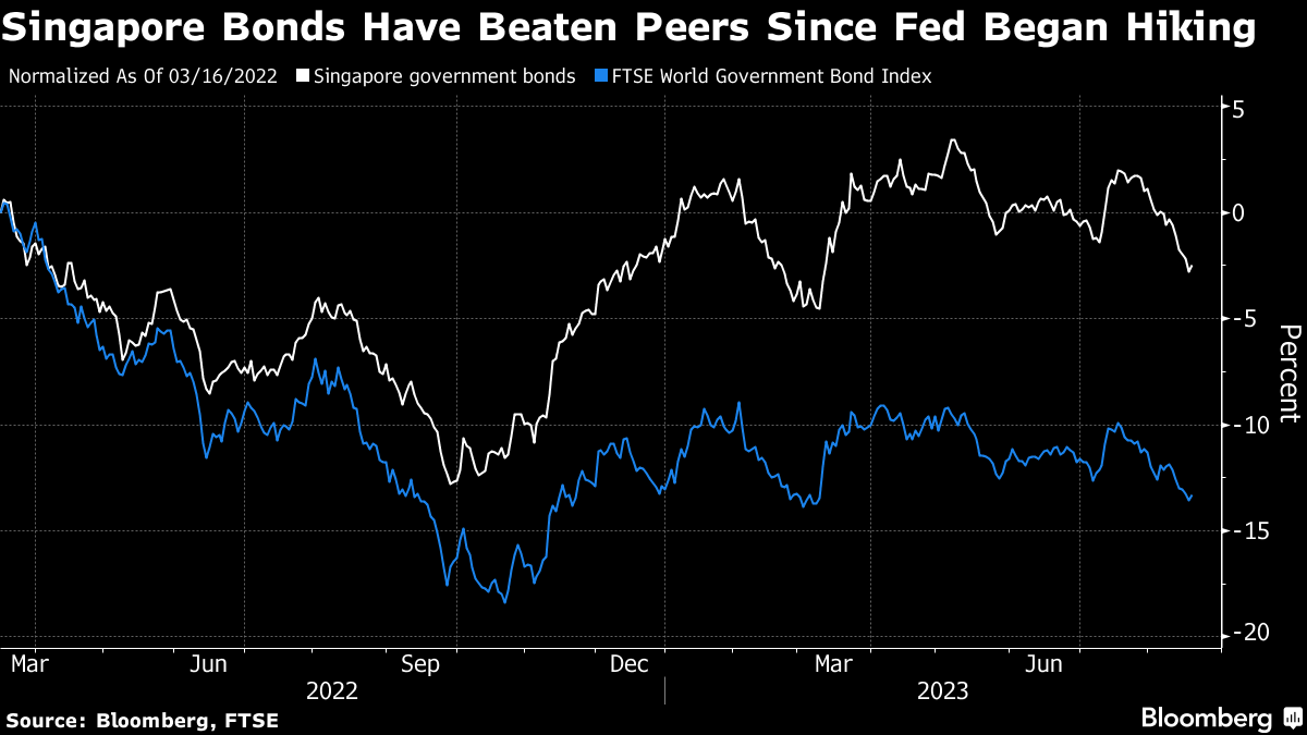 Singapore's local-currency government bonds have lost just 2.5% since the Fed started its tightening cycle on March 16 last year, while the world government bond index has slumped 13.3% over the same period, according to data compiled by Bloomberg.