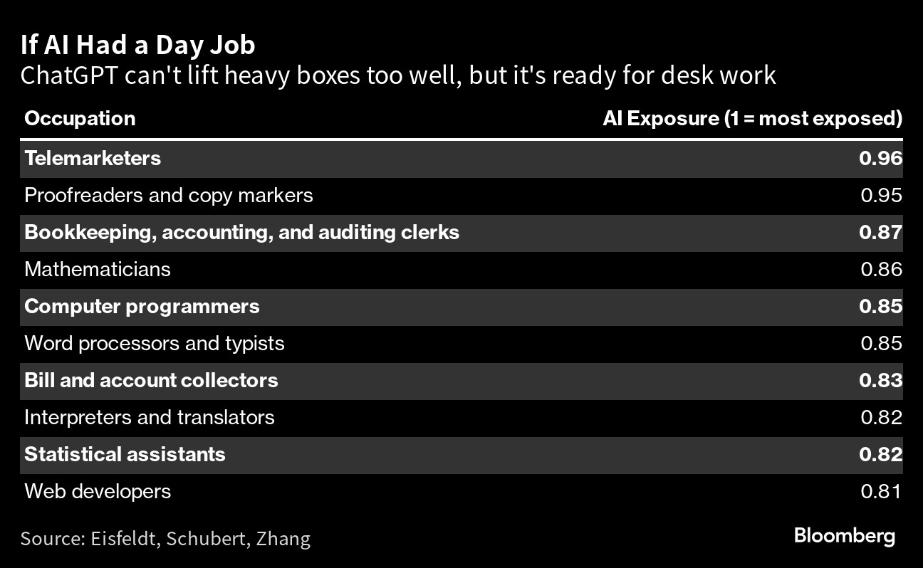 Given access to a database of 19,000 workplace tasks plus a raft of data pulled from LinkedIn and earnings calls, the robot oracle sent back a ranking of at-risk jobs clustered in the white-collar realm. Firms in finance, professional services and tech scored high when measuring “exposure of their labor force to being made more productive by tools like ChatGPT,” the authors say.