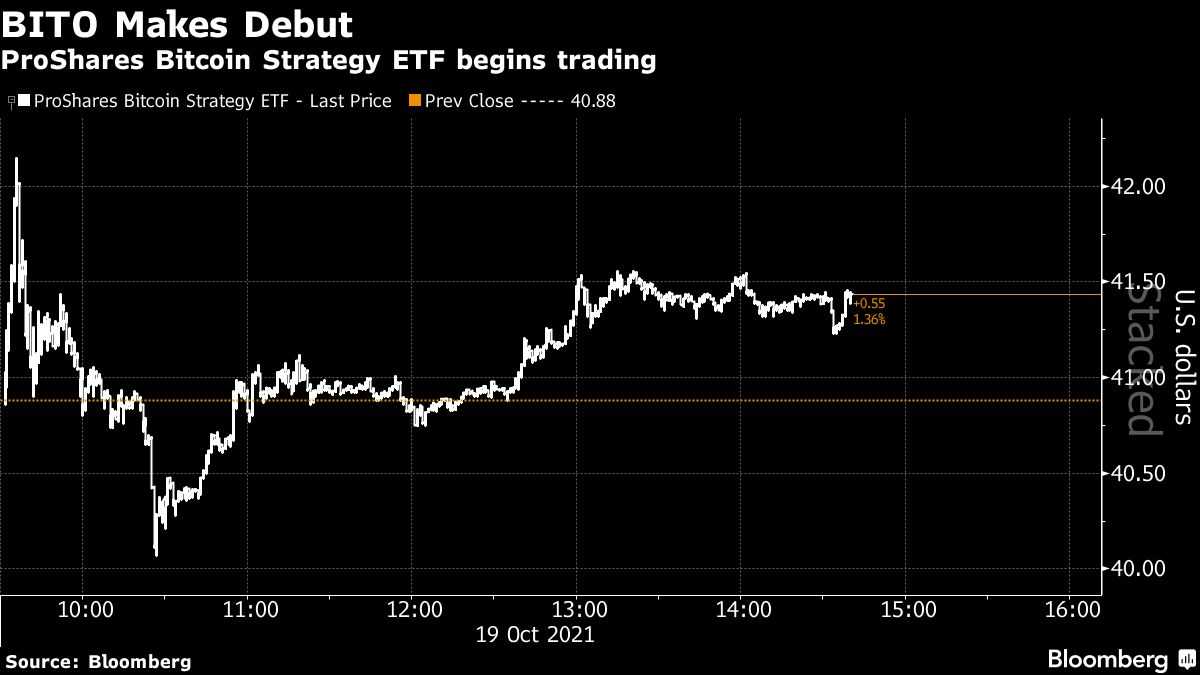 The ProShares Bitcoin Strategy ETF -- trading under the ticker BITO -- rose about 4.9% to $41.94. More than 24 million shares changed hands Tuesday, according to data compiled by Bloomberg. Because of the way the fund settles trades, net flows into or out of the product probably won't be known until overnight on Wednesday.