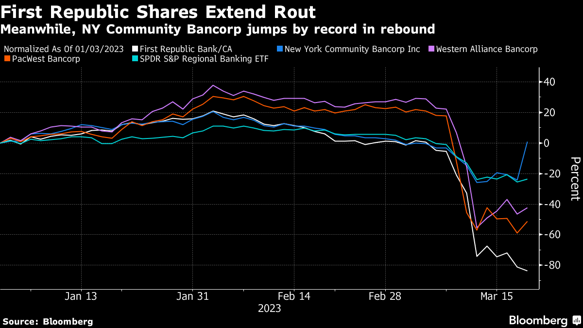 Shares of the struggling San Francisco-based bank slumped by as much as 22%, extending a recent rout that had taken First Republic down more than 80% in two weeks. Meanwhile, other mid-sized US lenders saw renewed interest from investors as New York Community Bancorp jumped by a record 40% after taking over Signature Bank's deposits and some of its loans. Western Alliance Bancorp rose 9.7%, while PacWest Bancorp gained 23% and the KBW Regional Banking Index added 3.6%.