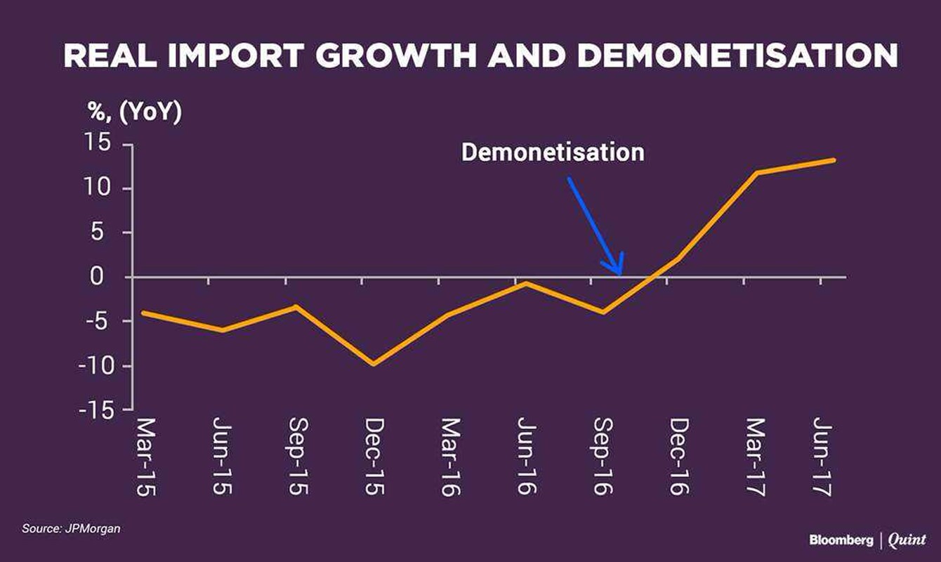 Data compiled by JPMorgan shows that imports (excluding gold and oil) rose in the months after demonetisation. This, Aziz explained, suggest some disruption in supply chains due to the cash exchange program announced in November 2016.
