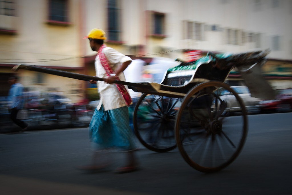 A rickshaw puller tows his fare down a street in Kolkata (Photographer: Brent Lewin/Bloomberg)