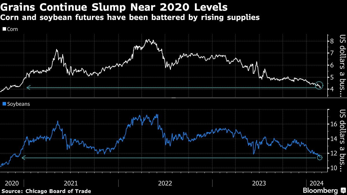 Grains traders may be wondering whether a bottom is in for prices, with corn and soybean futures trading near the lows from 2020. Ample supplies and lackluster demand, particularly for soybeans, have weighed heavily on investor sentiment, with hedge funds turning the most bearish on grains — including corn — since at least 2006. Traders will await the US Department of Agriculture's monthly WASDE report on Friday for the latest assessment of domestic and foreign markets.
