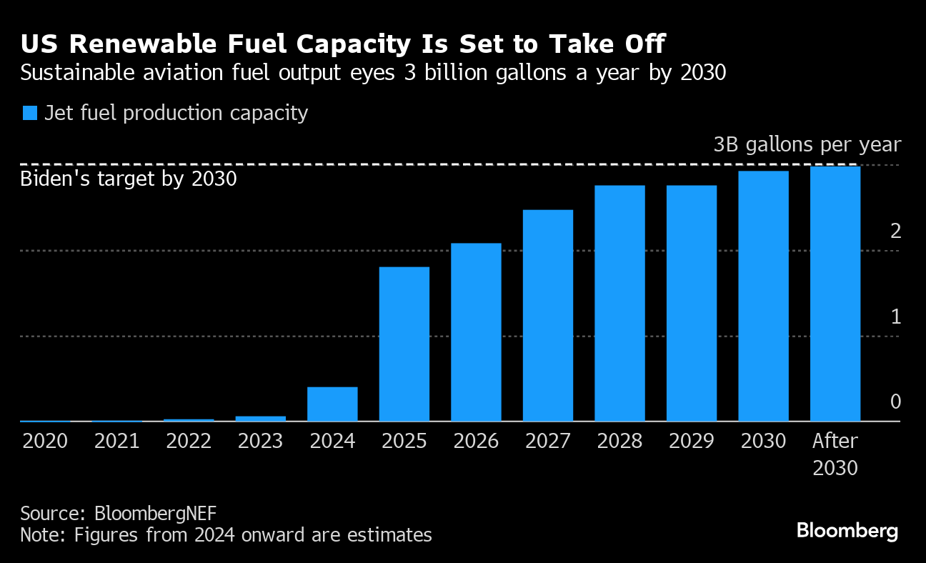 US production of sustainable aviation fuel — or SAF — is on track to reach almost 3 billion gallons a year by 2030, according to BloombergNEF, putting it just shy of President Joe Biden's target of “at least” that amount. Tax credits from his landmark Inflation Reduction Act are driving a flood of investment into the market and bringing more projects online. The fuel, which is made from waste oils or agricultural feedstock, is seen as the one of the most powerful emissions-reduction tool for airlines. Bloomberg Intelligence estimates that SAF capacity will need to increase 30% annually for decades in order for carriers to meet their zero-carbon targets.