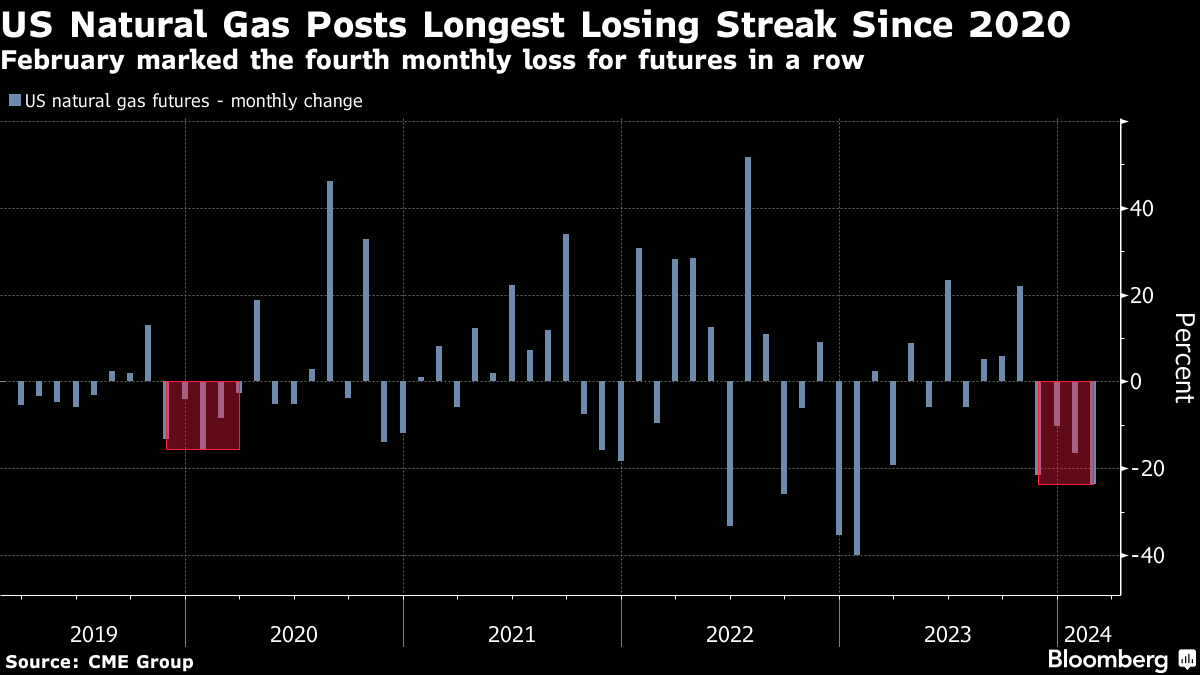 US natural gas futures capped a fourth monthly loss in February after prices plummeted to lows not seen since June 2020. An unusually mild North American winter has dampened demand for the home-heating fuel as production soared, prompting the longest streak of monthly declines for gas contracts since the beginning of the pandemic. Analysts expect prices to remain depressed for awhile, given that forecasts show unseasonably warm weather for much of the next month. Meanwhile, US inventories continue to hover well above typical seasonal levels, with stockpiles in the latest week sitting about 27% above the five-year average — adding further pressure to prices.