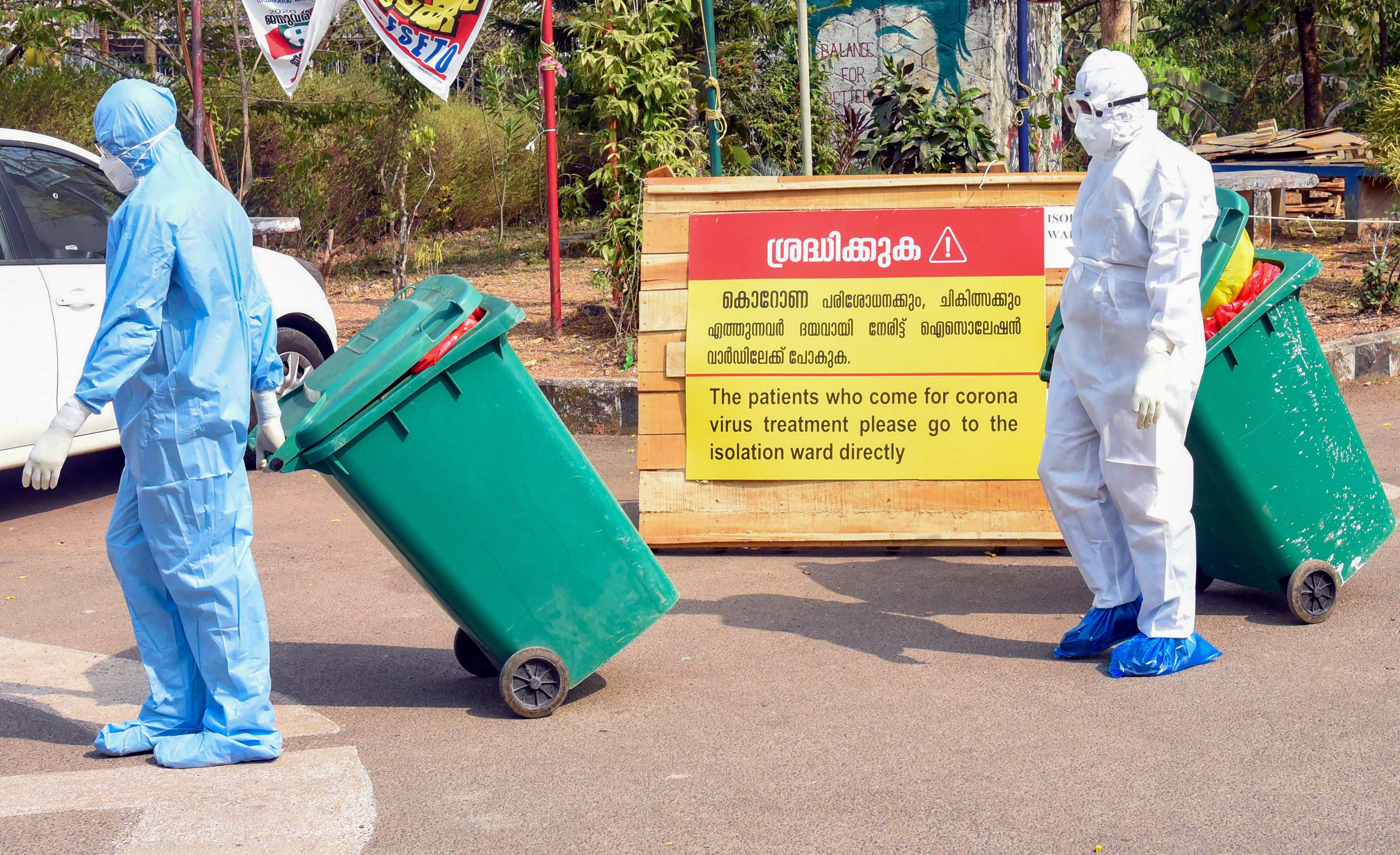 Medical staff, wearing protective suits, hold medical waste as they exit the Special Isolation Ward set up to provide treatment to novel coronavirus patients at Kochi Medical college, in Kerala. (Source: PTI)
