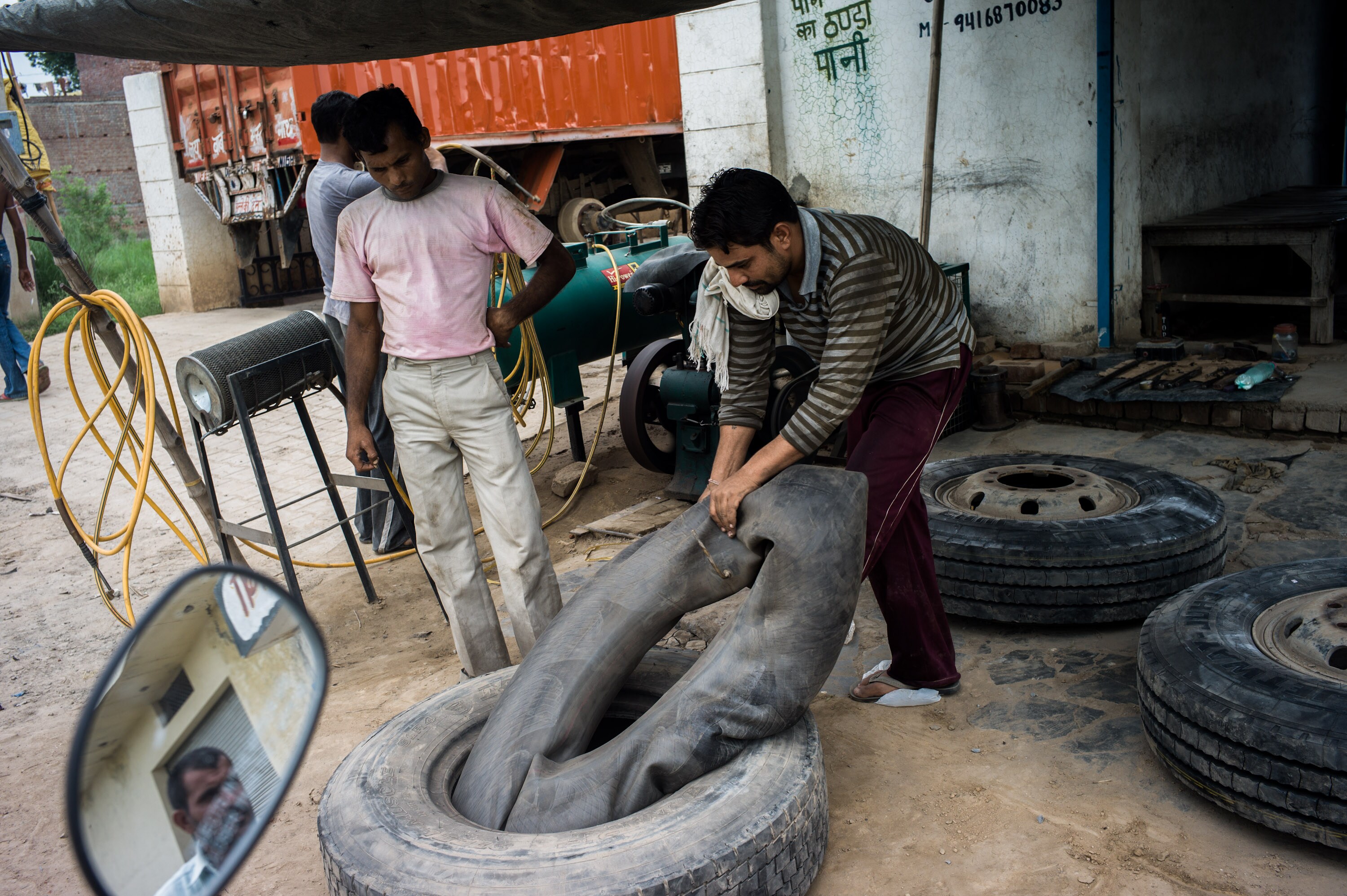 A mechanic works on a punctured truck tyre, in Ambala, Haryana. (Photographer: Sanjit Das/Bloomberg)