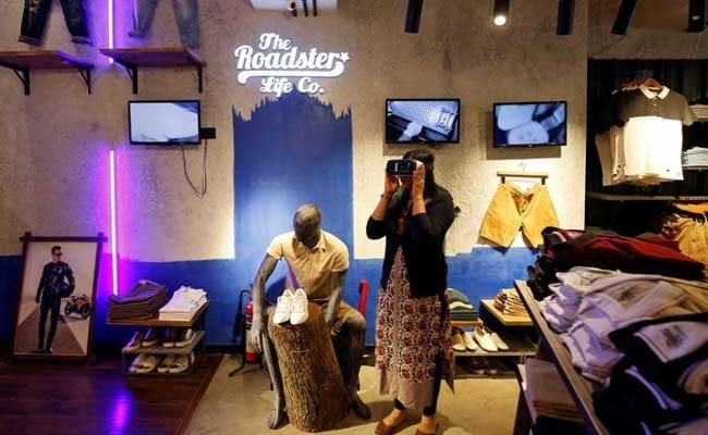 (A customer poses with a virtual reality headset as she browses through a catalouge of products inside a Roadster store in Bengaluru, May 28, 2018)