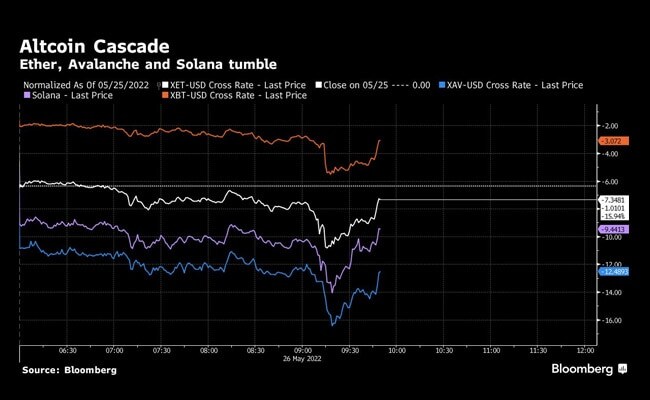 Other tokens linked to protocols popular with decentralized finance projects like Avalanche, Solana and Polkadot were also slumping, down between 11% and 17% over the last 24 hours.