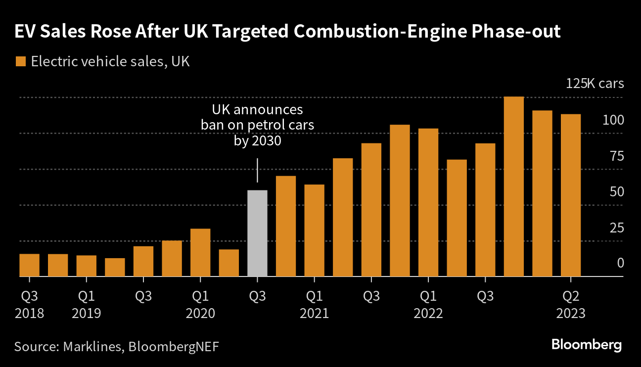 Prime Minister Rishi Sunak is considering rolling back some green-energy policies to help consumers weather a cost-of-living crisis. The potential measures, which could include a five year delay to the planned 2030 ban on petrol and diesel car sales, risk pushing off course Britain's broader plan to reach net-zero by mid-century. Sunak is scheduled to hold a Cabinet meeting on the government's green agenda later Wednesday.