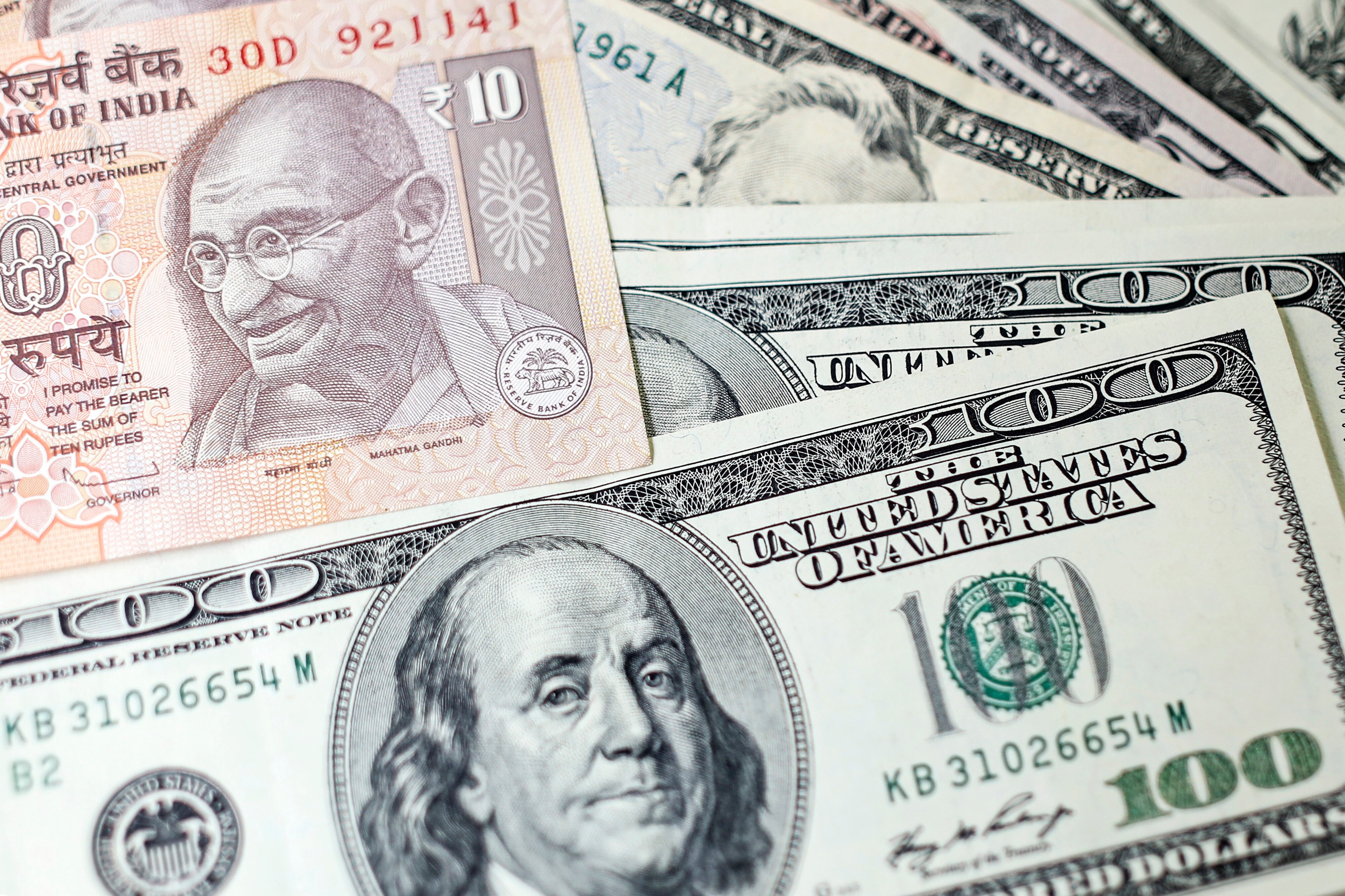 An Indian ten rupee banknote and U.S. one-hundred dollar banknotes are arranged for a photograph in Mumbai, India. (Photographer: Dhiraj Singh/Bloomberg)